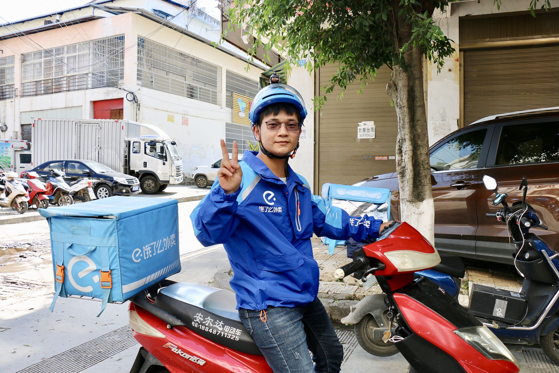 这位外卖小哥名叫沈兴跃,马关人,今年20岁,是饿了么文山站物流部的一名骑手,负责文山城区域订单的配送。