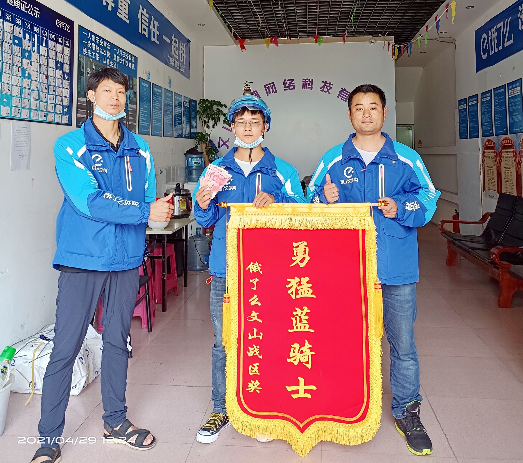 在送餐的视频火了之后,饿了么文山站4月29日表彰了沈兴跃。当沈兴跃从站长欧本洲手中接过写有“勇猛蓝骑士”几个大字的锦旗、“爱岗敬业”证书及500元奖金时,他开心极了,因为当天刚好是他20岁的生日。“这是一份最好的生日礼物,我很喜欢!这份礼物会一直激励着我努力奋斗!”沈兴跃兴奋地说。