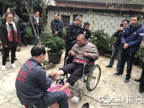 文山市的张云松已经42岁了,属于重度二级肢体残疾,生活不能自理,平时靠65岁的父亲照顾他。12月27日一早,文山市“阳光家园计划”承接方暖心家政服务有限公司的工作人员来到张云松家,为其扫地、洗碗、收拾屋子,并帮他量血压、理发、洗头、剃须,这让张云松心情大好:“‘阳光家园计划’对于我们这些残疾人来说真的太好了,给我们的生活减轻了不少负担,谢谢他们来我家帮我们打扫卫生,家里也收拾的干干净净的,还帮我理头发,帮我洗头,心情也变好了。”