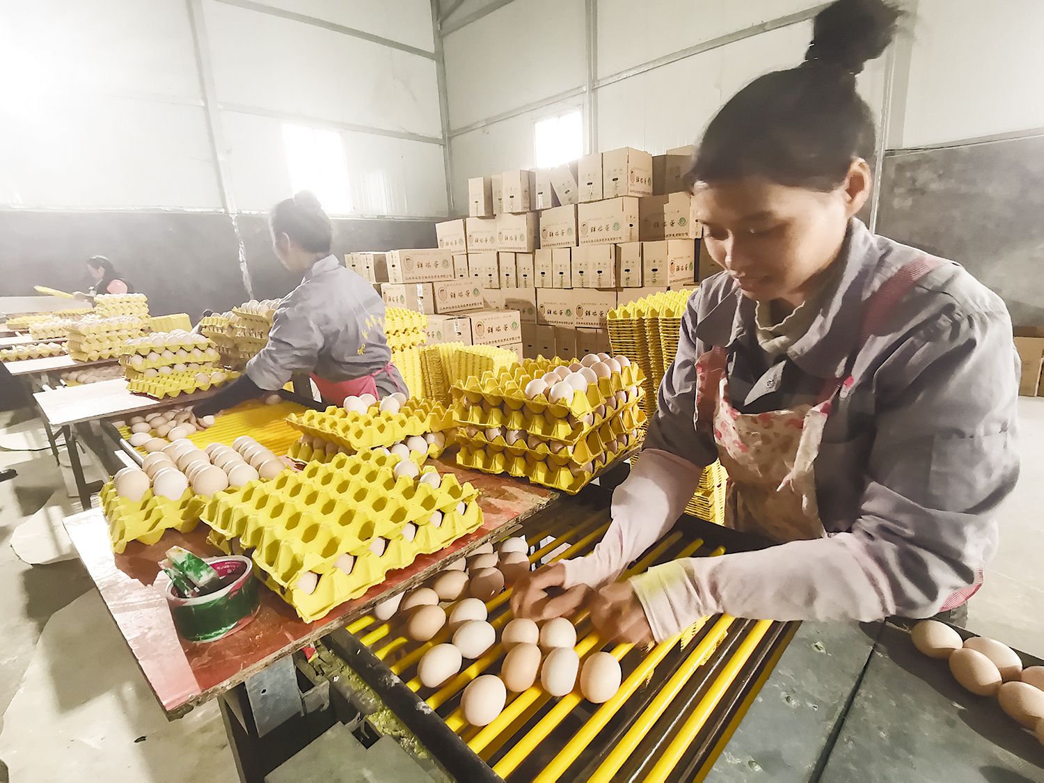 在拣蛋区,几名女工正忙着拣蛋打包。传输带上,圆滚滚的鸡蛋“排队”经过,手脚利索的李小香三两下就把个头均匀的蛋选好装好。闲聊中,得知她也是本村村民,和丈夫都在这里务工。她拣鸡蛋每月有5000多元的收入,多时6000多元。丈夫负责配送饲料,每月收入4000多元。说起这些,她非常开心。她说,在家门口上班太好了,老人孩子都能照顾到,公司还供3顿饭,安排住宿,这样算下来,每年收入已经很高了,比外出打工要强出千万倍。