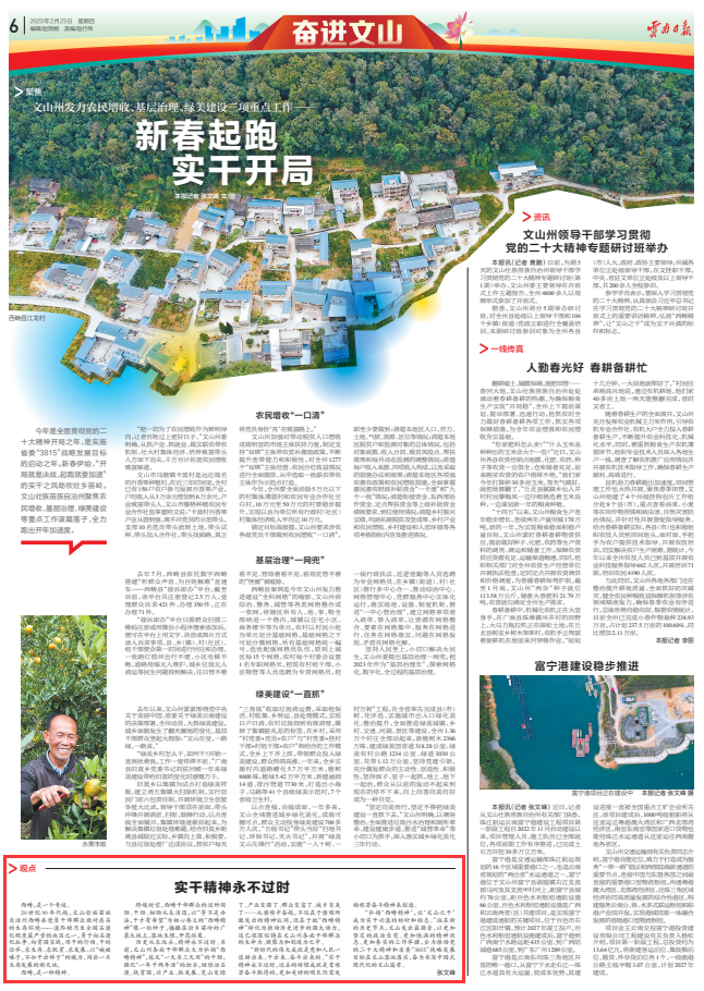 “弘扬‘西畴精神’,让‘文山之干’成为实干兴滇的标杆和标志。”站在新的历史节点,文山发出最强音,以更加坚定的政治自觉、更加饱满的精神状态、更加务实的工作举措,全力推动党的二十大精神和省委“3815”战略发展目标在文山落地落实,奋力书写中国式现代化的文山篇章。