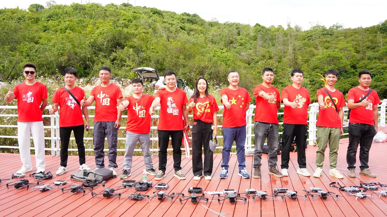 当天下午,10架无人机齐刷刷摆放在东山公园观景台上,经过爱好者们的精心改装,10面五星红旗被安全地悬挂在无人机上。随着“起飞”声令下,飞手们眼神专注地操控遥控器,用专属方式表达对祖国最深的祝福。
