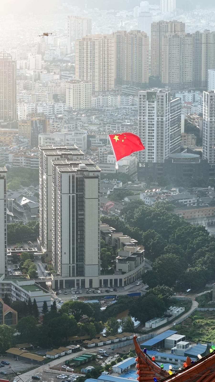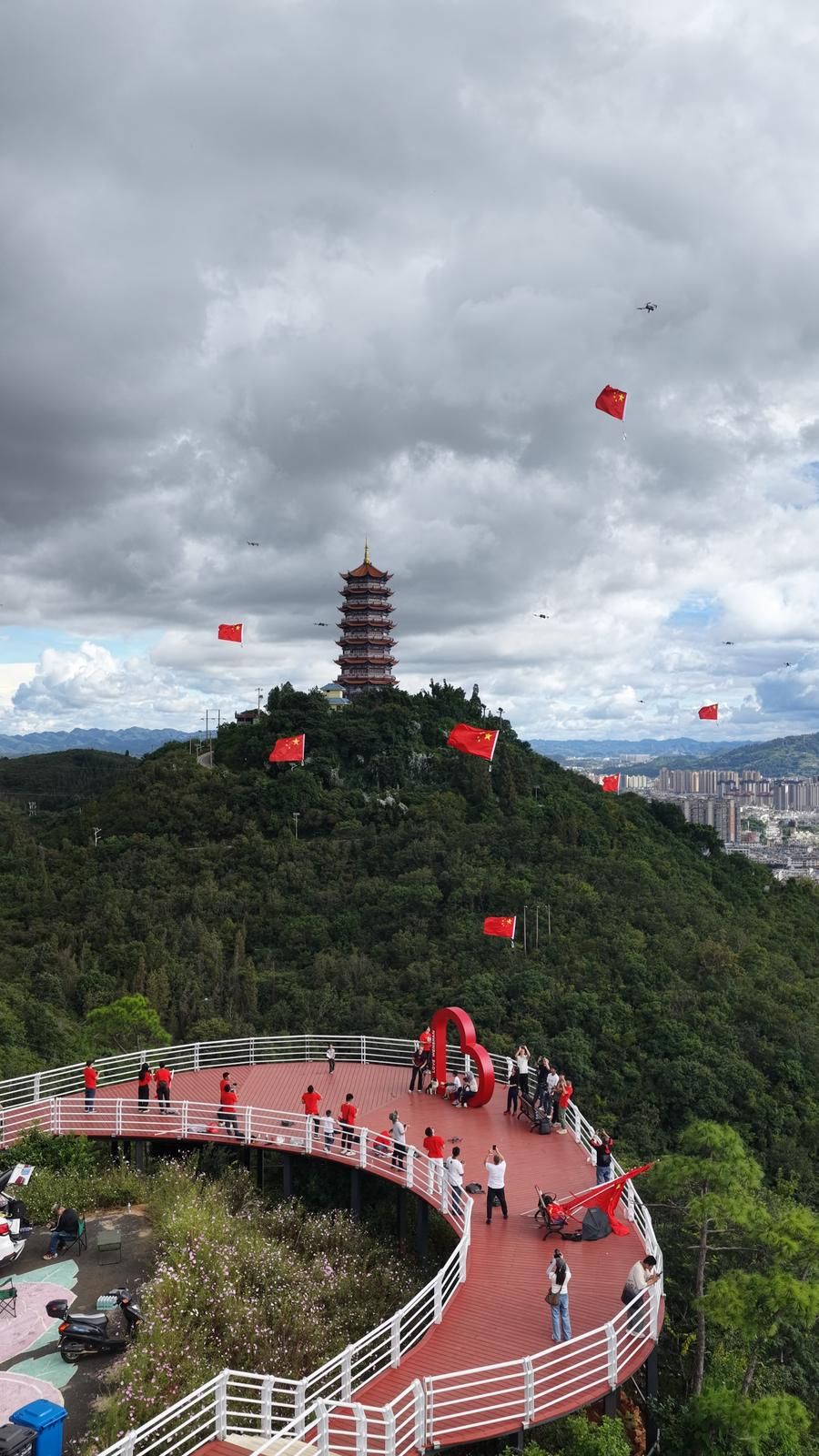 鲜艳的五星红旗在无人机的牵引下缓缓升空。风猎猎!旗飘扬!那抹红色在阳光下格外耀眼,与文山文笔塔融汇成一首最动听的华章,青山绿水间,仿佛在向每一寸土地诉说:“祖国,生日快乐!”