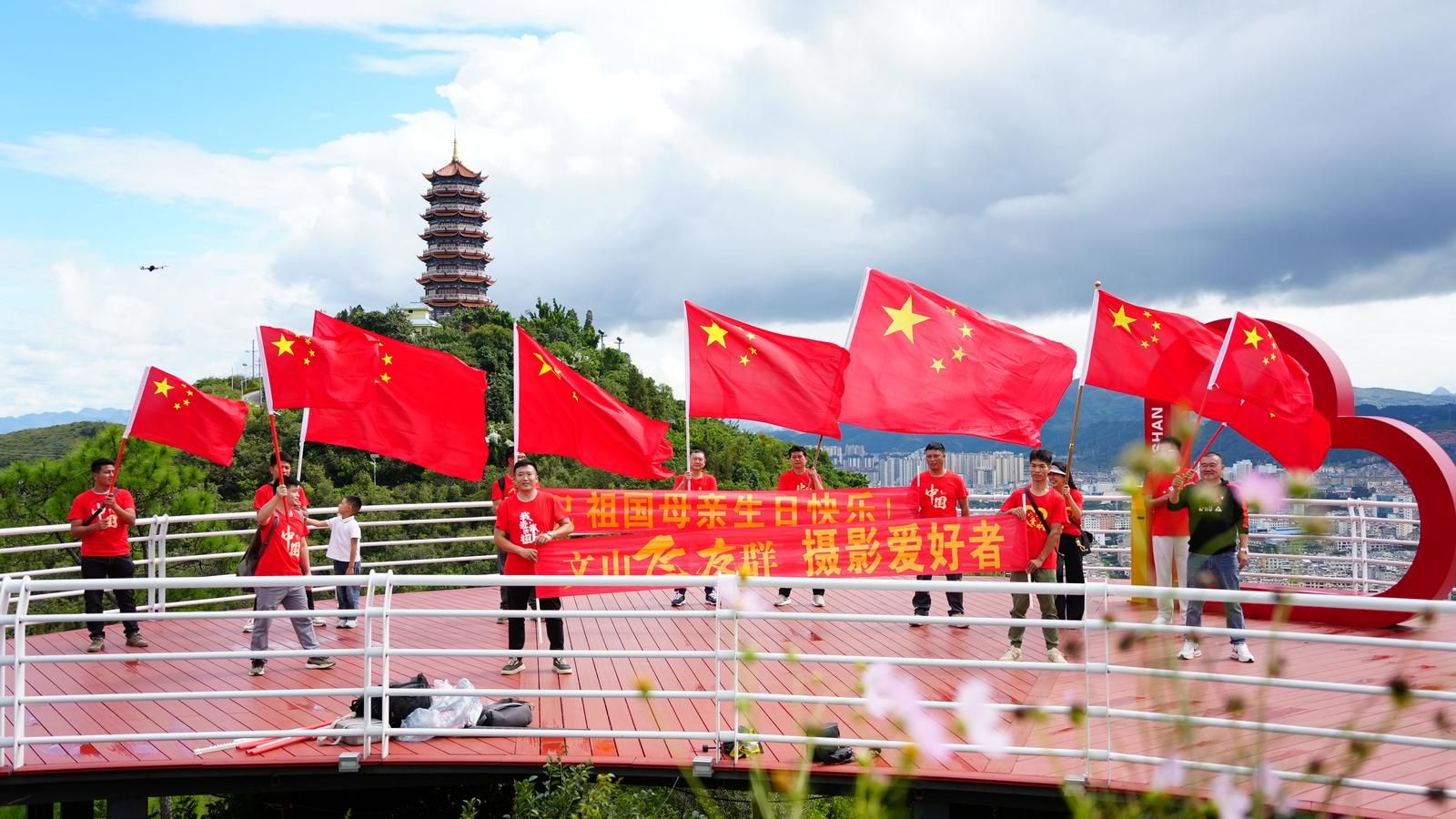 9月27日,在文山市东山公园文笔塔上空,一场别开生面的国庆庆祝活动正精彩上演。20余名“文山飞友群”摄影爱好者齐聚一堂,用最纯粹、最硬核的方式,表达对祖国母亲最深沉的祝福。