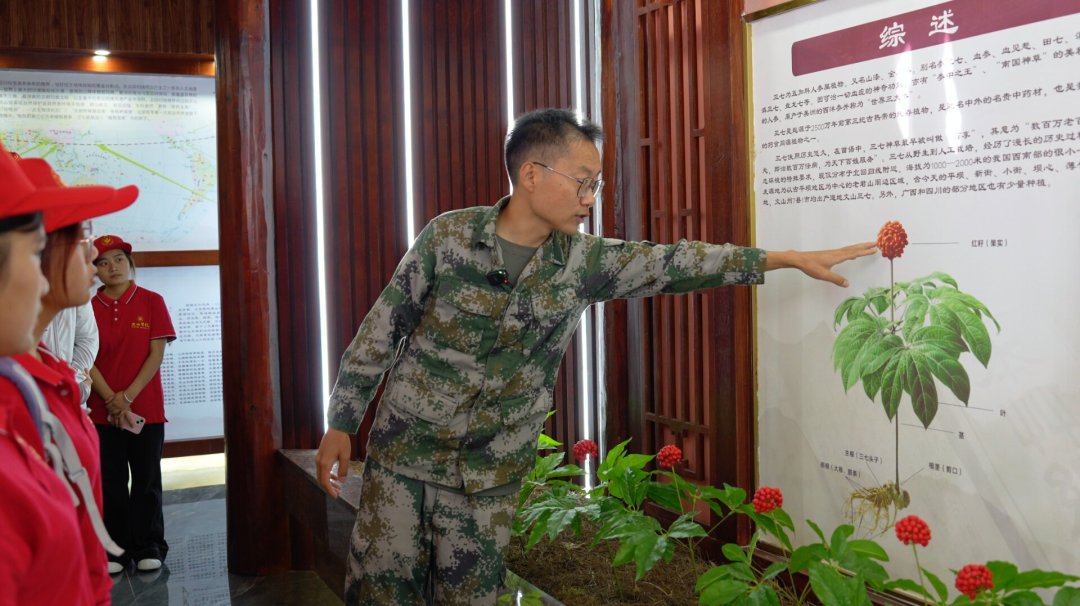 平坝镇亦是“南国神草”三七的发源地,其种植历史悠久。当师生们走进文山三七溯源馆,馆内的展陈层层递进,讲解员将三七的故事娓娓道来。从记载着先民发现三七的药用价值,到现代科学育种的场景……一幅幅图文,清晰勾勒出三七从“山间野草”到“名贵药材”再到“多元产品”的发展历程。听着讲解员的讲述,同学们深刻体会到这份“神草”背后的民生温度。“我真切理解了‘三七全身是宝’这句话的含义,从种植到加工,三七的每一环节都凝结着人民的智慧与汗水。”文山学院2025级人工智能专业学生李荣珍说道。