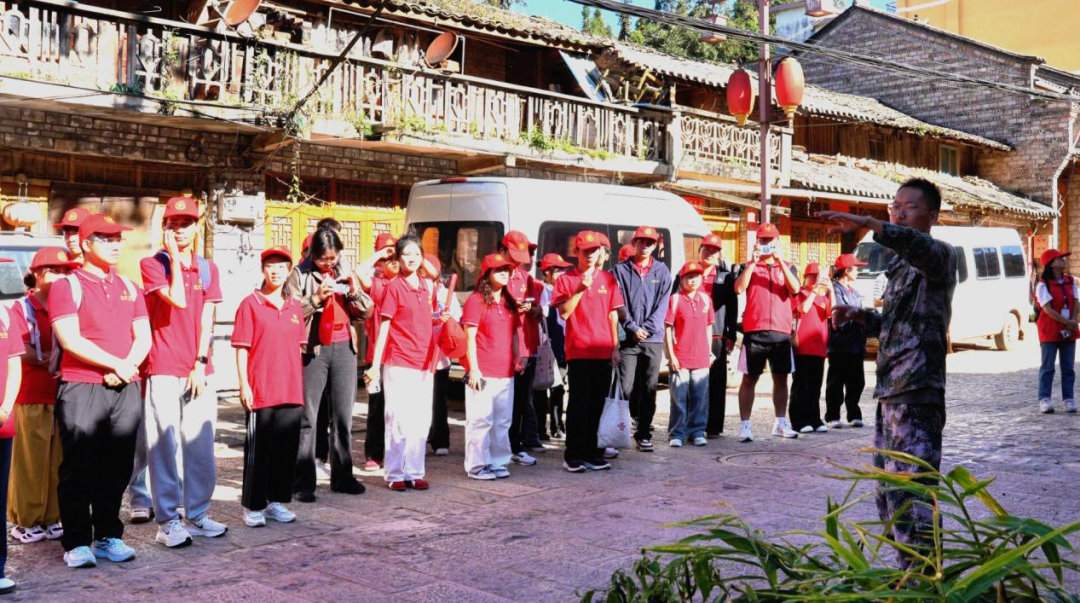 深秋的文山市平坝古镇,檐角垂落的玉米串、地面铺展的金黄色玉米颗粒,将丰收的气息揉进了秋风里。师生们在讲解员带领下,踏着被岁月磨得温润的青石板路缓步前行,眼前的清代砖木民居错落排布,“走马转角楼”的木雕纹样清晰如初。同学们驻足凝神,认真聆听讲解员细数古镇过往的商贸繁华——马帮叮当的旧时光,如今活化利用古建筑发展文旅的新路径,一路跟着讲解的节奏,同学们沉浸式感受古镇的过去与现在。