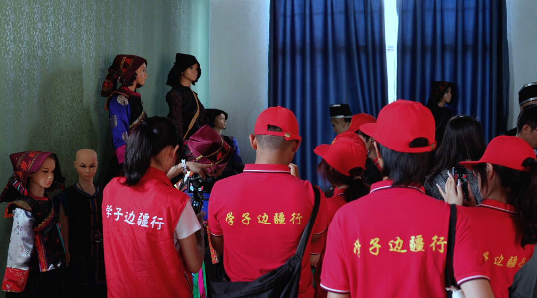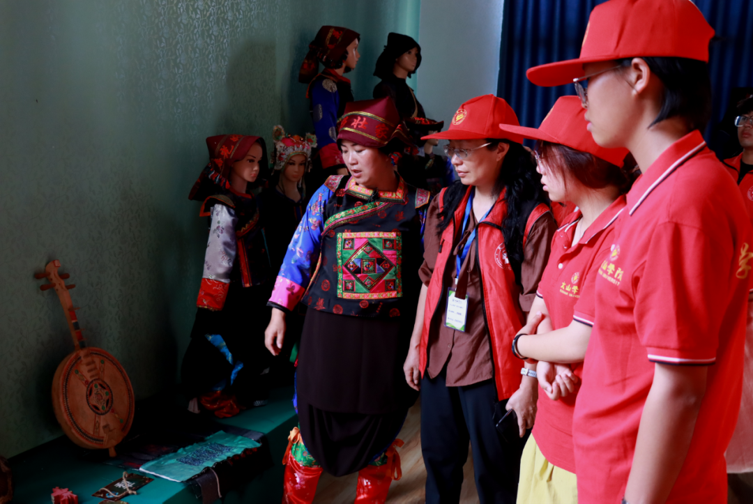 体验完纸马舞,师生们还走进了牛头寨文化传习馆,馆内陈列着丰富的民族文化展品,壮族的蜡染衣裙、苗族的百褶裙、彝族的刺绣头帕色彩斑斓,木质的纺车、竹编谷篮带着农耕岁月的质朴,铜鼓、芦笙等乐器似能奏响往昔节庆旋律。每一件展品都似在讲述着民俗故事与历史渊源,让同学们深刻感受了多民族文化交融的魅力。