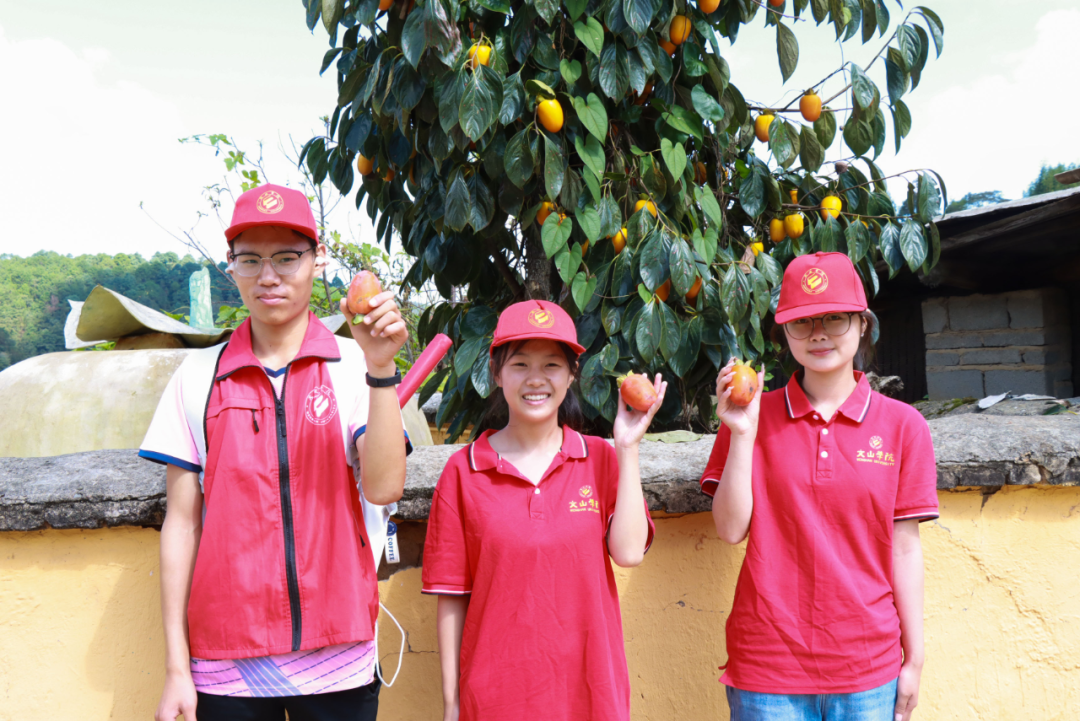 昔日默默无闻的沙老寨村,如今因满村柿子风情,成了远近闻名的“网红柿子村”。当车辆缓缓深入村子,沿途的景致吸引着师生们的目光:黄墙黛瓦的传统民居错落分布,家家户户房前屋后都藏着别致小景,墙面随处可见的以“柿”为主题的墙绘,为村庄增添了几分灵动的文艺气息。