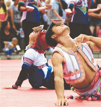 最引人入胜的,当数神灯舞中“滚弦子”的表演,只见舞者怀抱月琴,用脚尖和额头支地,在点燃烛火的碗间连续翻滚。其充满张力的舞姿,仿佛是不甘屈服的彝族人民与恶魔展开了生死搏斗,也寓意了一个勇敢的民族为了生存与大自然进行着顽强的抗争。