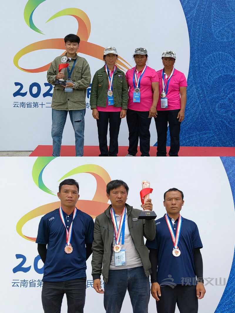 射弩赛场,传统女子跪姿项目中,文山代表团侯云丽力压群雄,资格赛以190环进入决赛,在决赛赛场上充分发挥技能技巧,而普洱队同样发挥出色,最终以1环之差惜败,获得传统女子跪姿项目银牌。同时,文山州射弩队也获得了传统弩混合团体银牌。