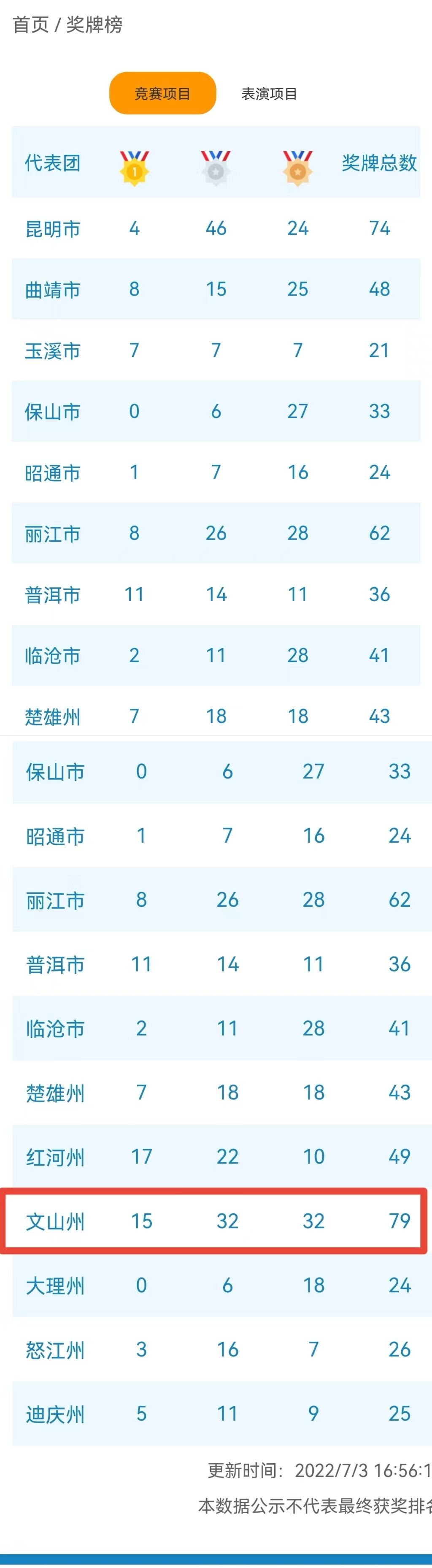 据了解,在第一阶段比赛中,文山代表队夺取7金27银20铜。截至目前,我州两个阶段比赛共获得79枚奖牌,奖牌数位于全省第一,金牌数暂居第二。