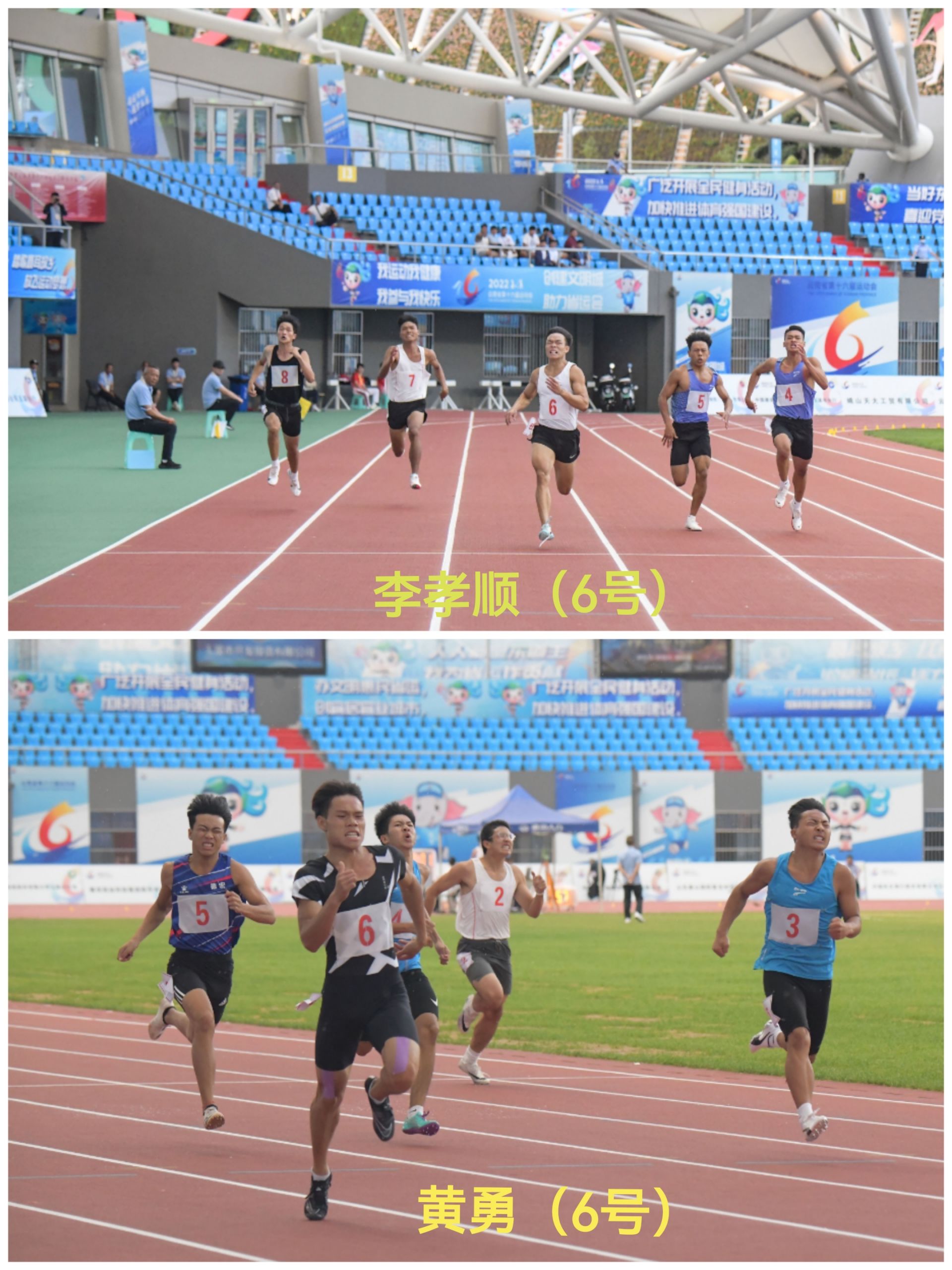 发令枪响起,位于第六赛道的李孝顺和选手瞬间弹了出去。进入弯道,利用自己的过弯技术,李孝顺快速超越了身边的选手,仅次于第三道的昆明选手进入直道。距离终点50米左右,李孝顺还落后第三道的昆明选手一个身位。李孝顺再次发力,一点点追了上去。冲线,二人以肉眼不能分辨的顺序冲过终点,大家都不敢确定是谁夺冠。在“漫长”等待中,大屏幕终于显示成绩,21.60秒,李孝顺和第三道的昆明并列第一,共享金牌,上演了一出王者归来的好戏。