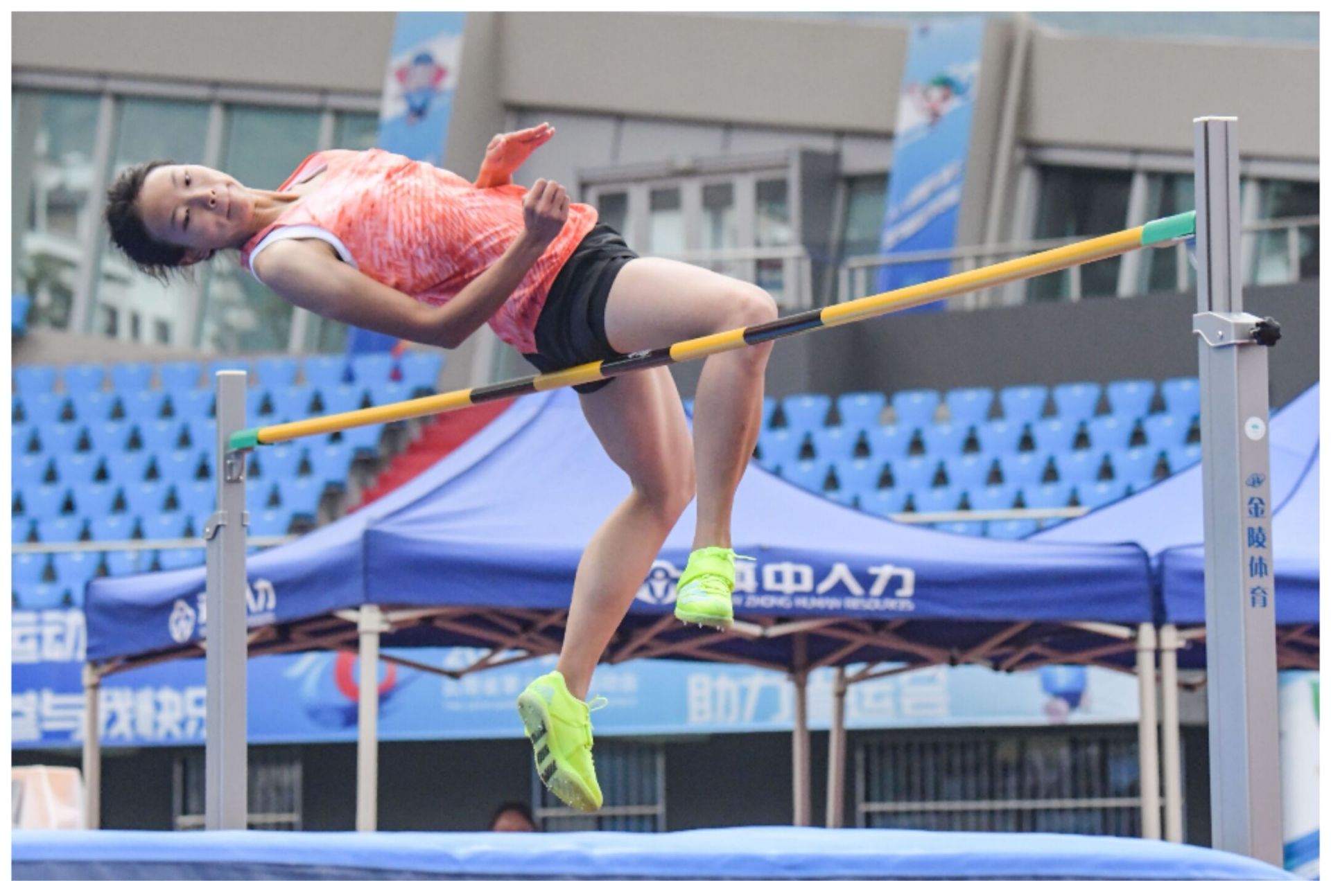 高度来到165厘米,赖贤明显感到了难度,加大了助跑的距离。但因为距离的增加,赖贤的步伐没能及时调整好,两次跑到跳杆前都放弃起跳。所幸经过短暂调整后,赖贤第一跳就成功越过跳杆。而在这一高度,玉溪选手前两跳均没成功,看台上的教练连忙把玉溪选手叫到一边面授机宜。在教练的教导下,玉溪选手第三跳成功越过跳杆。