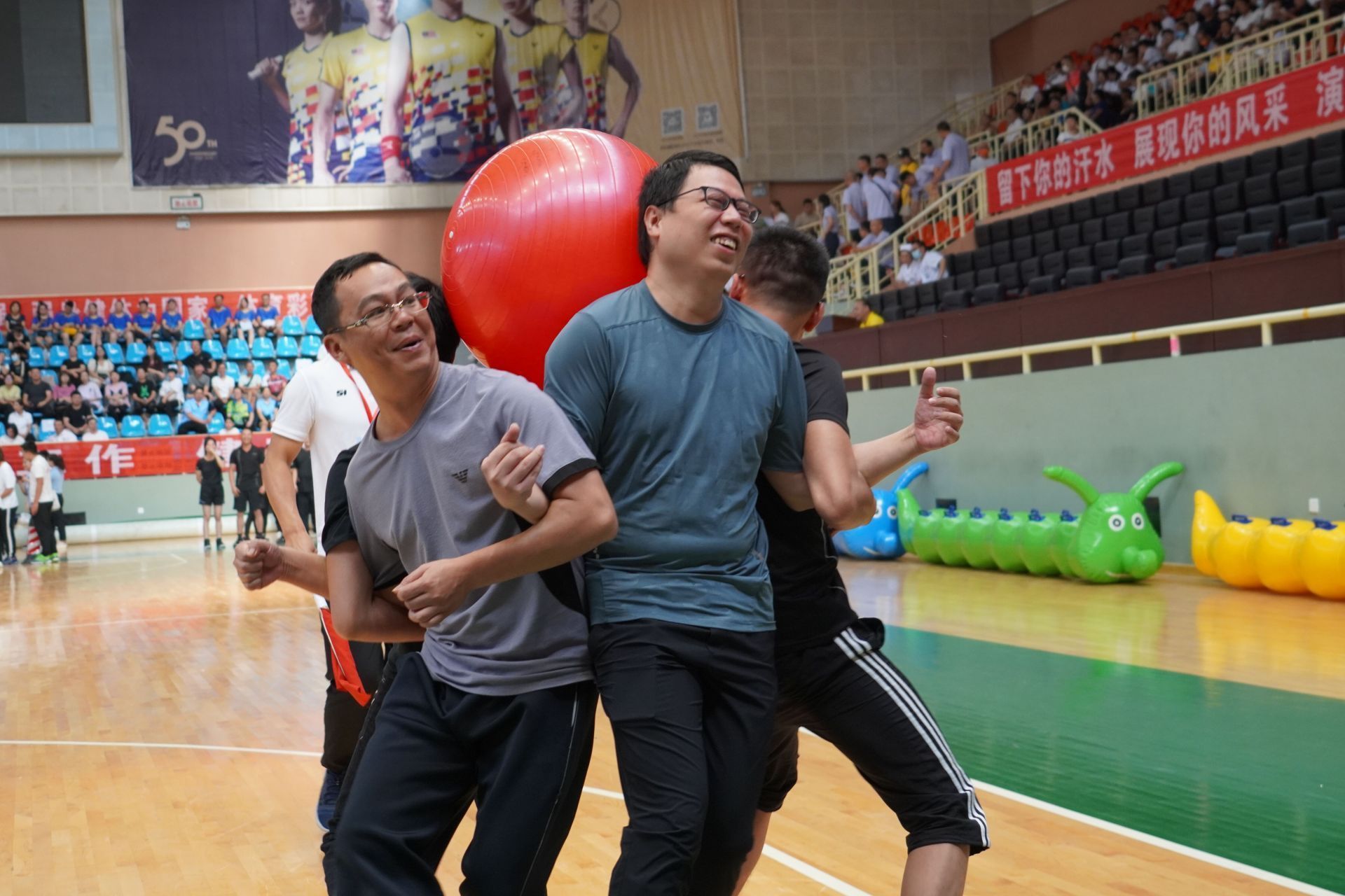 背夹球接力,拉拉队队员一边跟跑一边使劲加油助威,赛场内口号声、加油声一浪高过一浪。