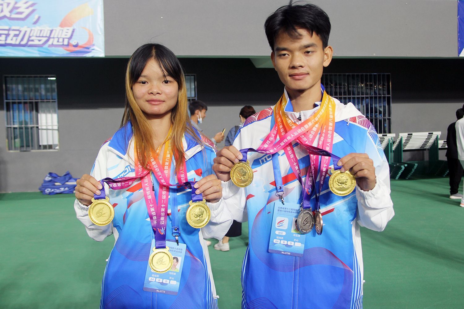 和往届一样,田径依旧是我州最大的“夺金池”。在本届运动会上,我州在田径这一主项上共获得13金5银11铜的好成绩,涌现出数名炙手可热的运动精英。方远伦在个人参加的T60级项目上傲视群雄,确立了无可撼动的地位。他先后夺得男子T60级800米、1500米、5000米、半程马拉松4枚金光熠熠的金牌,并参与T60级男子接力4×100、4×400,和队友一起夺取2枚铜牌。冯氏兄妹勇夺5金1银的战绩被人们所津津乐道。哥哥冯玉贤与妹妹冯彩妹分别参加男女组别T60级100米、200米、三级跳(冯玉贤)、跳远(冯彩妹)的比赛,哥哥夺2金1银,妹妹夺3金,哥哥还参与文山T60级男子接力4×100、4×400,与队友一起夺取2枚铜牌。被大家亲切地称为“小咪喳”的陆春是文山州运动员队伍中最受关注的存在。她在运动会开赛当天就以45分28秒08的成绩一举拿下女子T60级10000米比赛冠军,之后分别在女子T60级5000米、半程马拉松、1500米夺取金银铜牌。