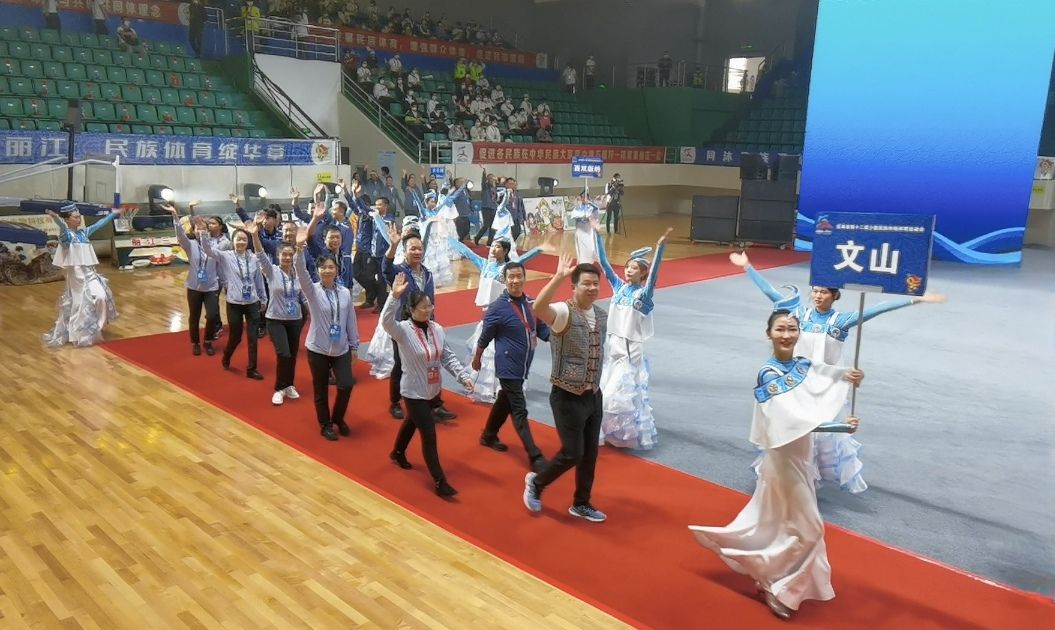 文山州代表团由125人(其中,团部25人、竞赛项目69人、表演项目和民族健身操共31人)组成,在三个阶段的比赛中,竞赛项目参加吹枪、射弩、陀螺、蹴球、板鞋竞速、高脚竞速、民族式摔跤、民族武术、民族健身操等9个大项79个小项的比赛;表演项目参加开幕式驻停表演、综合类、竞技类3类3个项目的比赛。