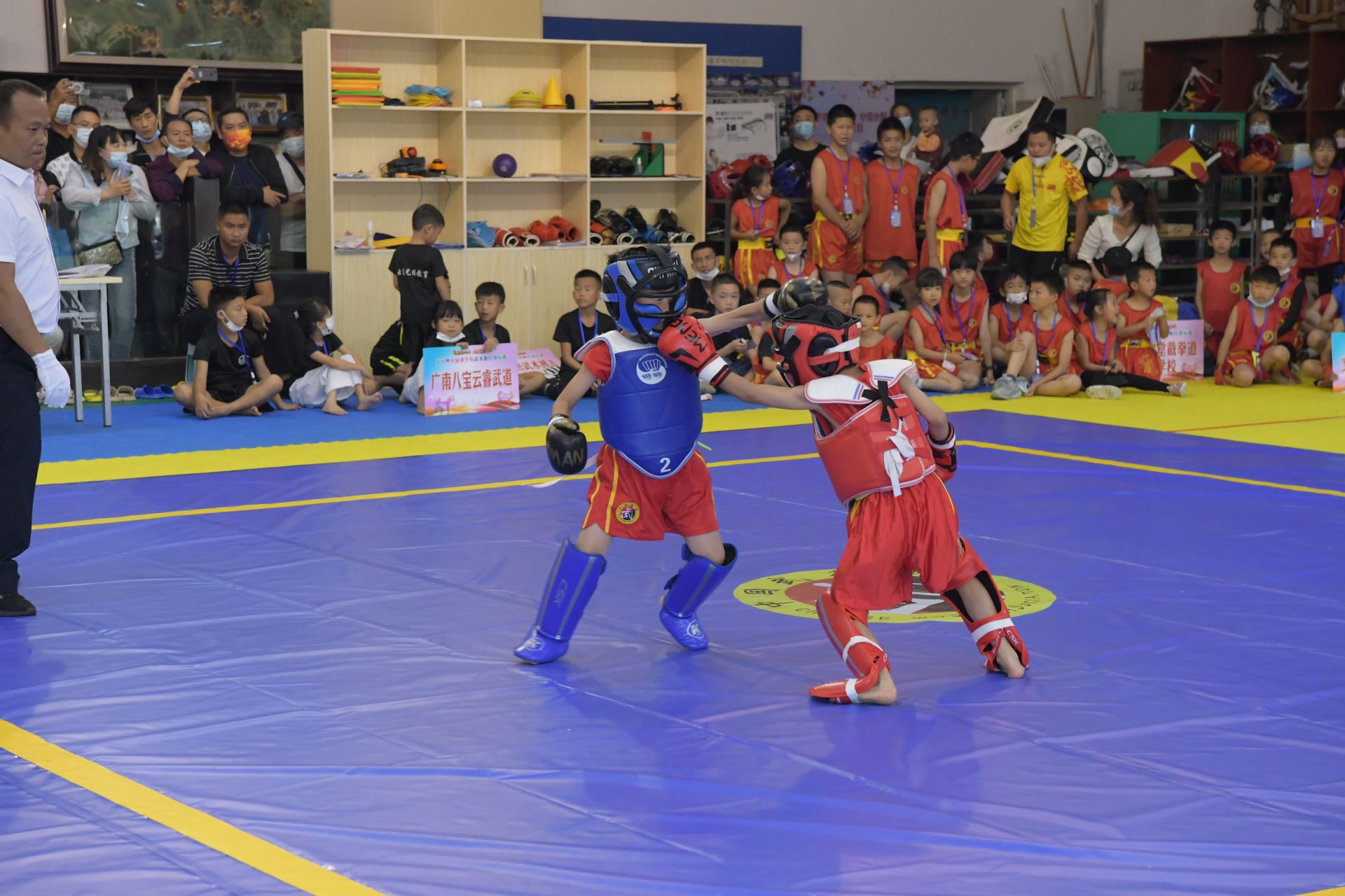 比赛中,萌娃们身穿护具、戴上拳套走上擂台,远踢、近打、贴身摔,虽然在速度力量上略有不足,但每一次拳打脚踢都尽情展示着自己的武术散打技术,诠释了顽强拼搏的体育精神。