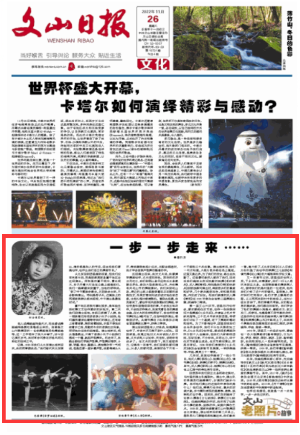 回想那年我们到丘北县雨勒壮族村,与村里的演出队搞联欢。演出中,演出队的男演员们跳棒棒灯,女演员们跳手巾舞。我问他们演出的这些动作表现的是什么?他们说,棒棒灯在丰收、喜庆的时候才跳,手巾舞则表现的是撒秧、栽秧、挑秧和打谷子等。回来后,我们及时编排了壮族小舞剧《三七姑娘》、群舞《三七姑娘》。在编排舞蹈动作时,我采用了壮族手巾舞的栽秧、挑秧动作,来提升舞台艺术。1989年,国家民委邀请文山州歌舞团去北京演出,演出结束后的第二天早上,服务员从门脚缝把报纸塞进来,我们拿来一看,高兴极了。《北京日报》《工人日报》分别刊登了我创作的群舞《三七姑娘》和情节舞《花山情》的大幅剧照和评论文章。