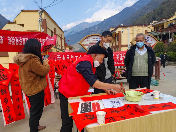 新春佳节之际,贡山县新时代文明实践办公室联合县文联、县总工会和茨开镇文化站举办“我们的中国梦——文化进万家”迎新春送春联文化惠民主题志愿服务活动,组织县书法协会会员走进社区、乡村,写福字、送春联,迎春送福,共贺新年。