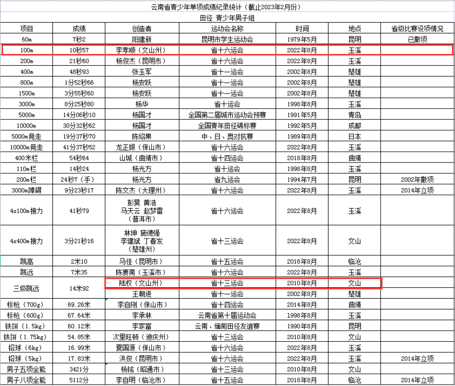 附件:云南省青少年单项成绩纪录统计(截止2023年2月份)