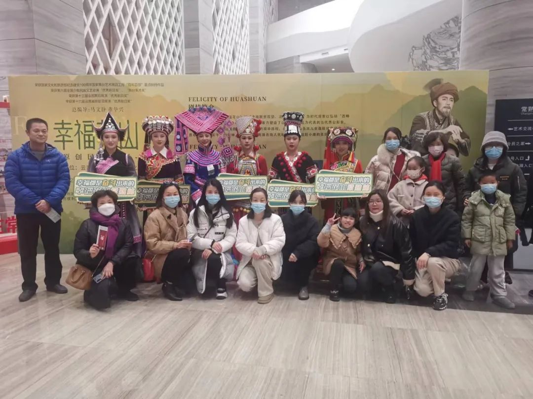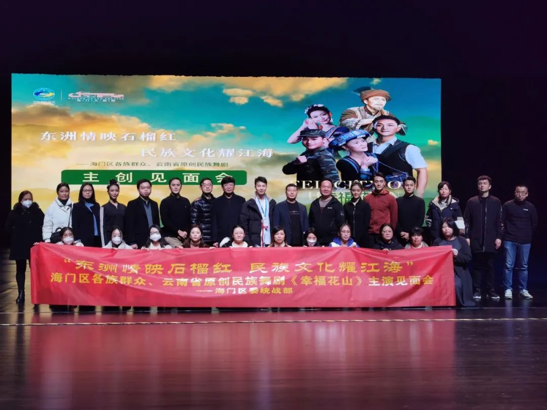 《幸福花山》南通站演出当天,参加了由海门大剧院举办的以“东洲情映石榴红,民族文化耀江海”为主题的见面会,文山州民族文化工作团的部分主创与南通的媒体及观众代表们相聚一堂,面对面提问交流,分享舞剧背后的那些故事。到现场参与见面会的观众,他们是南通市海门区民族团结进步促进会成员,区委统战部民宗科工作人员等。