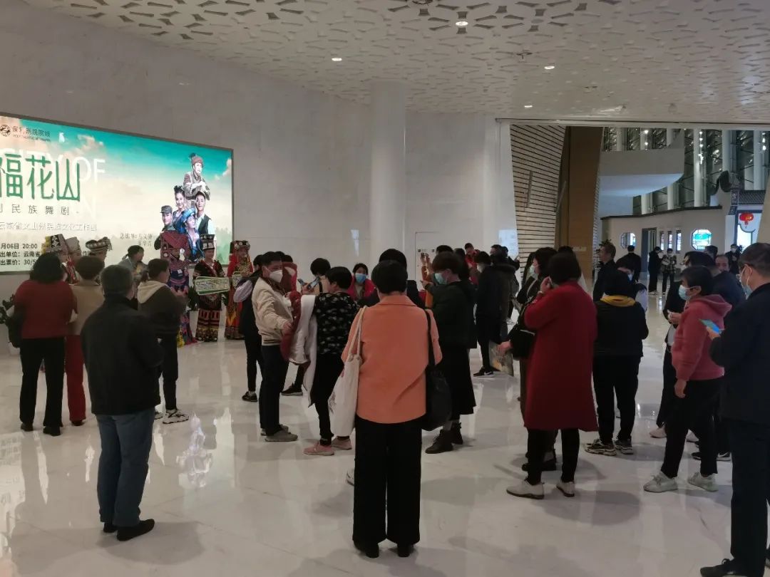 《幸福花山》四场演出场均上座率达75%以上。场场演出气氛热烈,观众都被感人的剧情和剧中边疆的自然风光、人文情怀所触动,他们毫不吝啬自己的掌声与欢呼,演员们多次谢幕,但观众依旧停留在原地向台上的演员们挥手致谢、久久没有散去,现场的氛围感动着剧组每一位演职人员。散场后,许多观众又重新回到门厅,在《幸福花山》的海报前合影留念。