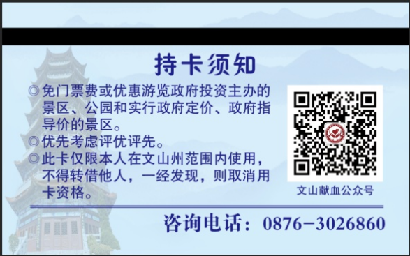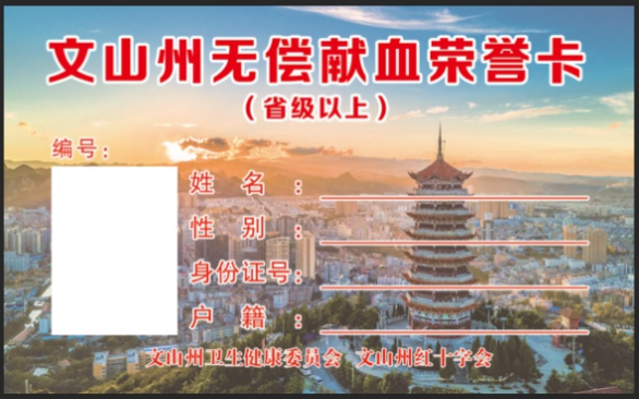 《通知》指出,符合政策享受对象个人可申请办理《文山州无偿献血荣誉卡》,凭卡享受相关政策优待。具体申领方式:通过扫描“文山州无偿献血荣誉卡申领信息采集二维码”,提交相关个人信息即可申请办理。州卫生健康委、州红十字会等部门将在7个工作日内完成信息审核及荣誉卡制作,并通知本人领取,联系电话:3026860。