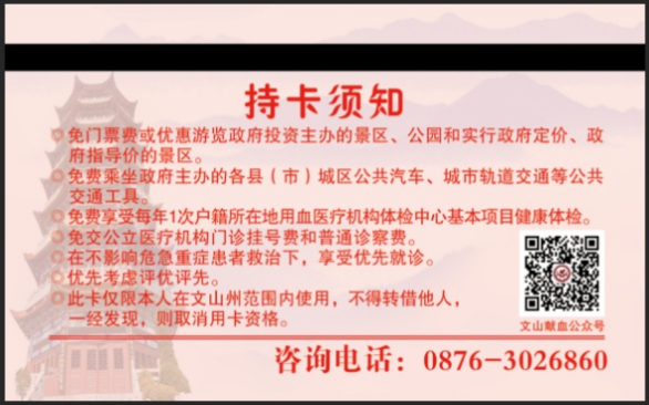 《通知》明确,成功申请《文山州无偿献血荣誉卡》(以下简称荣誉卡)的个人,可凭卡享受以下激励政策:一是免费乘坐市内公共交通工具,凭《荣誉卡》和有效身份证件可到各县(市)相应公交公司办理无偿献血免费公交卡(乘客意外伤害保险费用由个人承担),刷公交卡免费乘坐公交车;凭《荣誉卡》可免费乘坐城市轻轨。二是免费游览景区公园,凭《荣誉卡》和有效身份证件向指定景区专用售票窗口出示,经指定景区核对信息无误后,予免门票费用或享受有关优惠政策。三是免费健康体检,凭《荣誉卡》到户籍地指定用血医疗机构体检中心可免费进行基本项目的健康体检。四是免交门诊挂号费和普通诊察费,凭《荣誉卡》和有效身份证件向公立医疗机构挂号窗口出示,公立医疗机构工作人员核对无误后,予免门诊挂号费和普通诊察费。五是优先就诊,凭《荣誉卡》和有效身份证件向公立医疗机构挂号窗口出示,公立医疗机构工作人员核对无误并研判在不影响危急重症患者救治的情况下,予优先就诊。六是优先考虑评先评优,各级机关、企事业单位、社会团体、基层自治组织、民营企业等对受表彰奖励的无偿献血者、志愿者、造血干细胞捐献者,优先考虑评先评优。