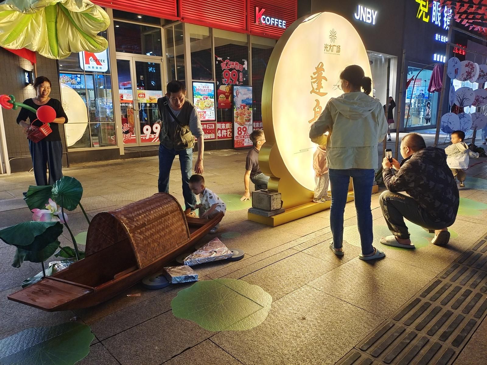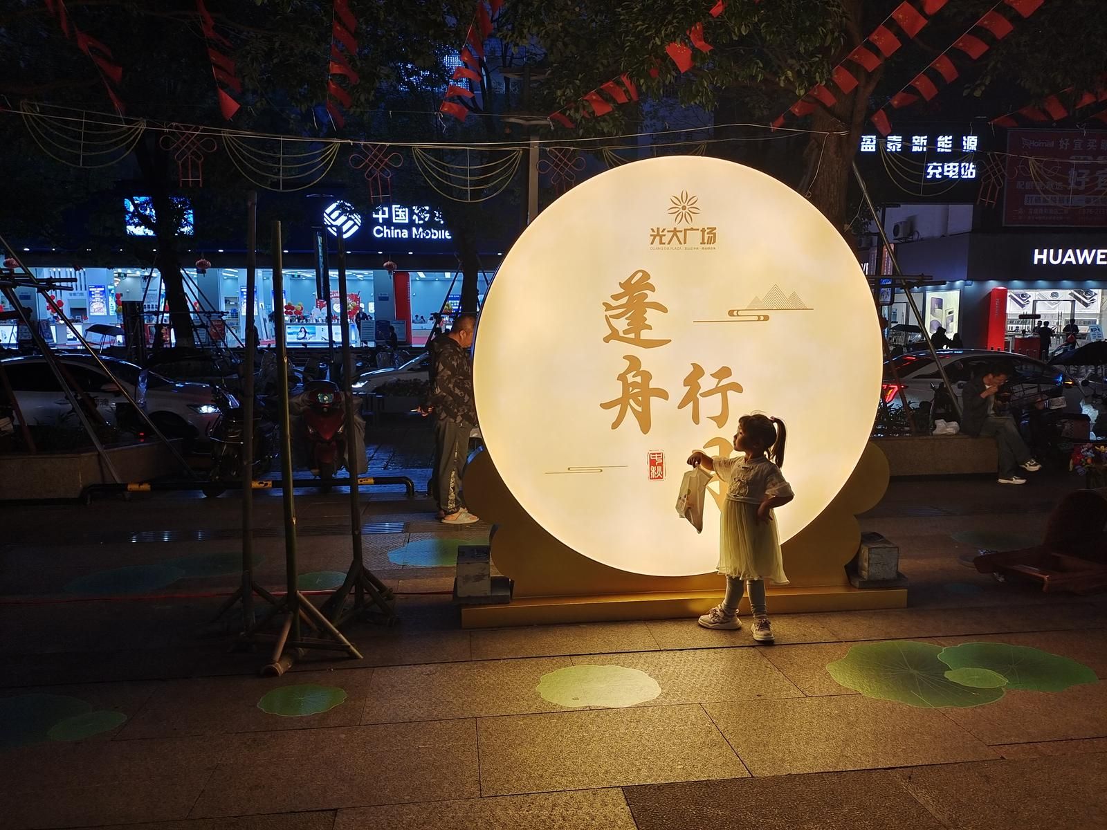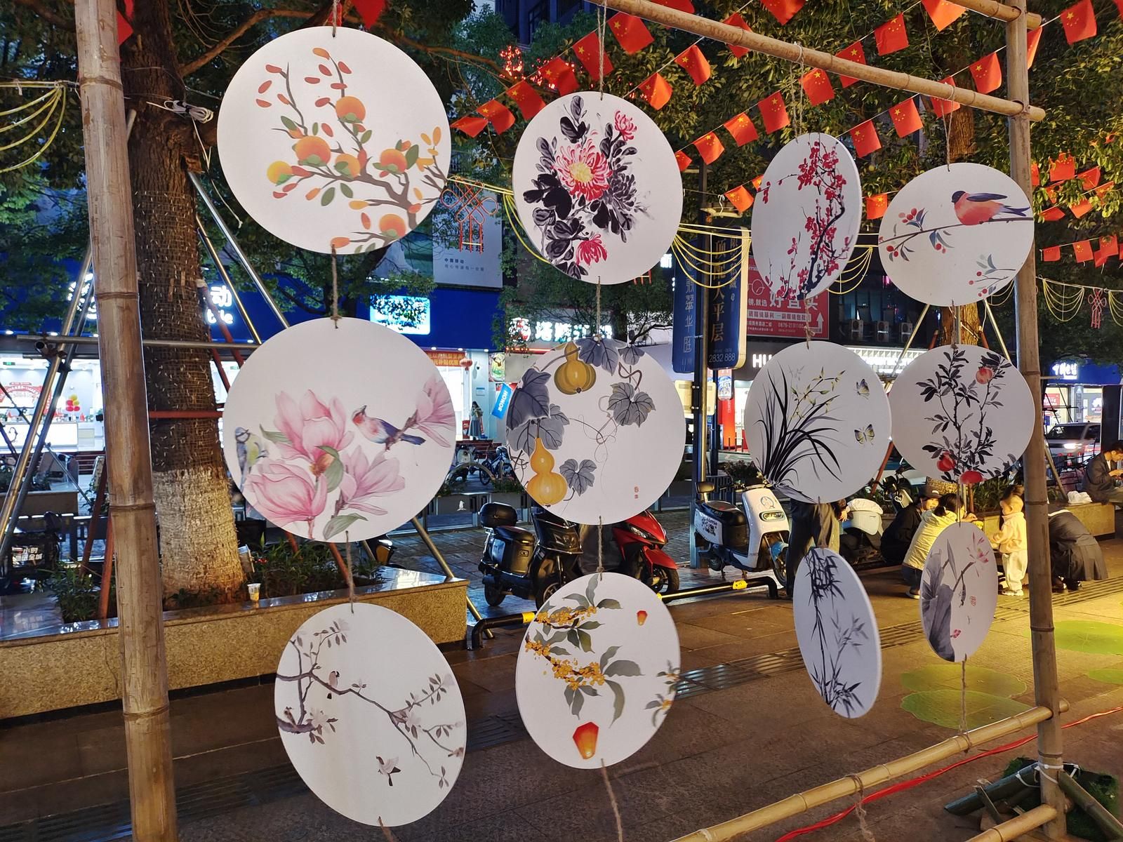 走在夜晚的东风路上,不难发现,节日的氛围早已铺陈开来,挂着的红灯笼与飘扬的五星红旗交相辉映。街道中央的仿圆月灯饰,散发出柔和而温暖的光芒,仿佛在为行人指引回家的路,人们纷纷与之合影,用手机记录这浪漫时刻。