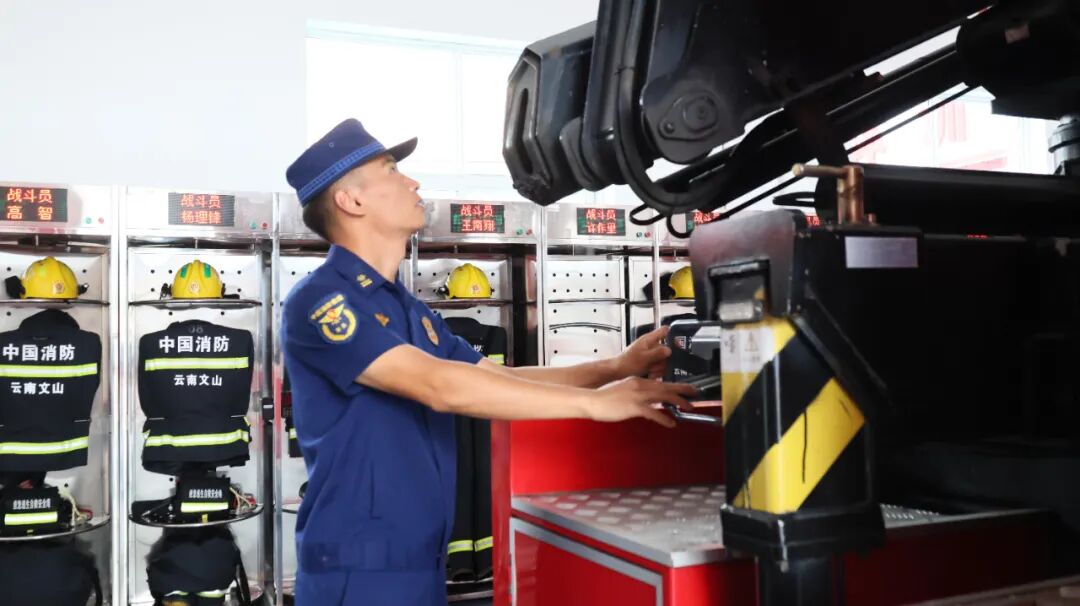 消防营区内,文建飞和队友们正对消防车进行全面检查:水带、轮胎、油压、警报系统……每一个细节都不放过。节日期间,他们不仅加强备勤,还深入景区、乡镇开展防火宣传。警铃一响,他们即刻出动,用专业与速度筑牢安全防线。