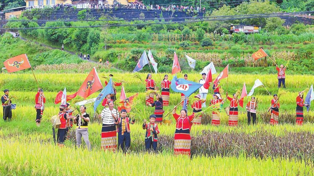 田园间的民俗趣味活动,让游客“沉浸式”体验丰收乐趣。割稻谷比赛、打谷比赛、摸鱼比赛……笑声、欢呼声交织,这里成了欢乐的海洋,凝聚起促进民族团结、助力乡村振兴的合力。