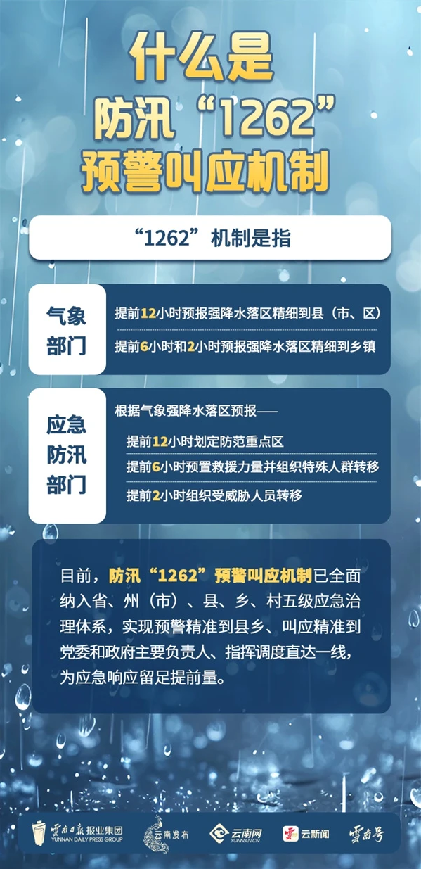 云南暴雨多发、河网密布、地质灾害突出,是全国防汛救灾任务最重的省份之一。省委、省政府下决心改变这种状况,学习借鉴省外先进经验,在2022年汛期创新建立了“1262”预警叫应机制,即:全省各地提前12小时、6小时、2小时发布精细到县、乡镇的强降水预警,完善以气象灾害预警信息为先导、递进式气象灾害预警服务的应急联动机制。