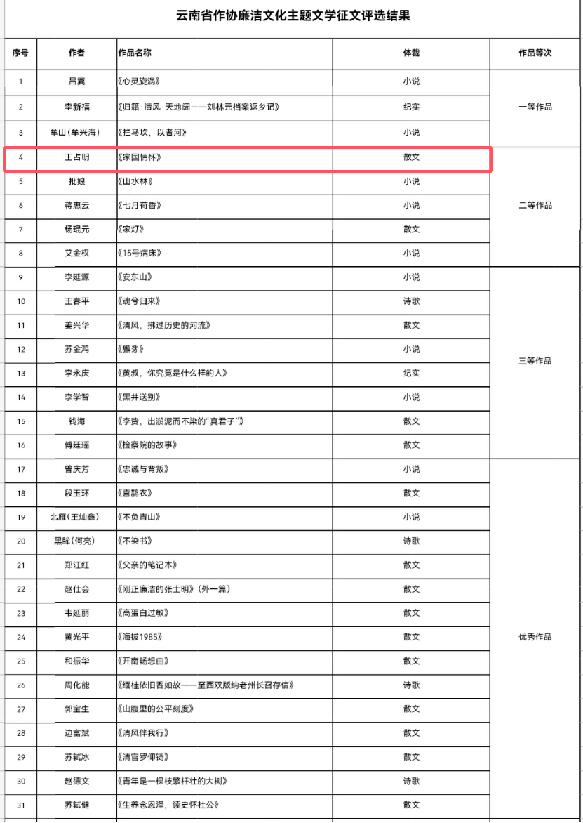 日前,云南省作家协会举办了弘扬廉洁文化主题文学征文活动,共收到来稿172篇。经组织专家严格评审,评出一等作品3篇,二等作品5篇,三等作品8篇,优秀作品15篇。其中,文山作家王占明的散文《家国情怀》,喜提二等奖。
