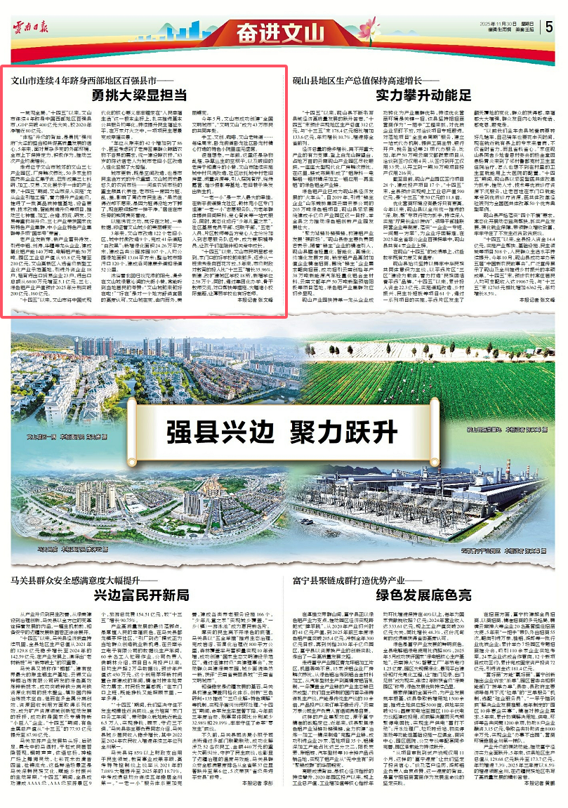 《云南日报》报道文山市连续4年跻身西部地区百强县市——勇挑大梁显担当
