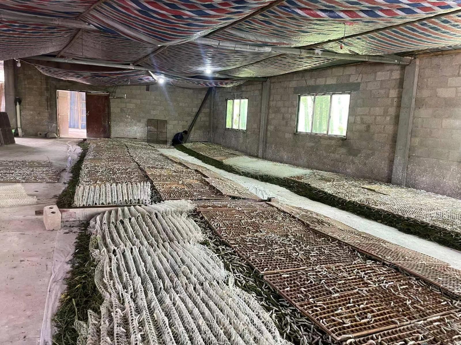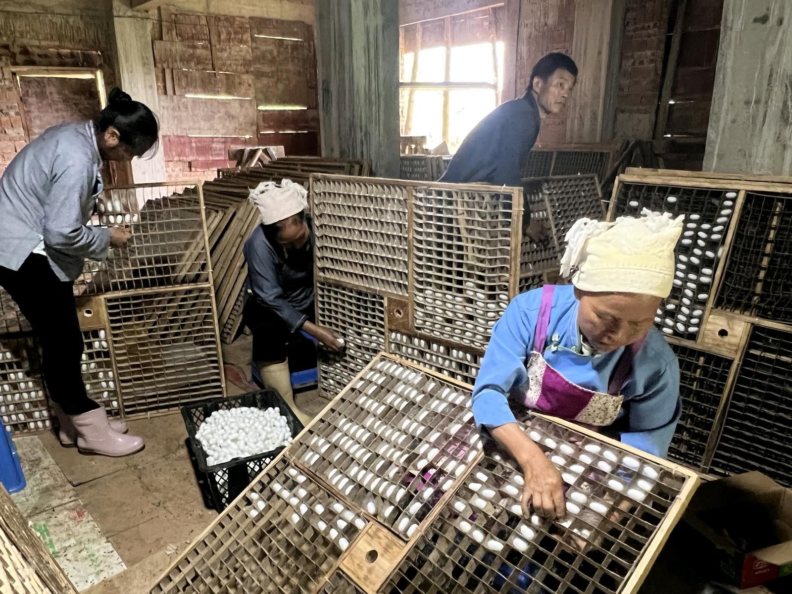 而种桑养蚕,这门古老技艺也正在延续。2018年,田蓬镇田房村村民蔡梅为照顾家庭,和丈夫返乡养殖桑蚕,在自家林地种植10亩禾桑,借助15万元的创业贷款,建成600平方米标准化厂房,到2023年,她的桑蚕养殖年收入已达15万元。秉持“一人富不算富,大家富才是富”的信念,蔡梅将厂房设为“实训基地”,手把手传授蚕室搭建、幼虫培育等技术。在蔡梅的示范引领和技术支持下,农户利用房前屋后空地、闲置房屋发展“微养殖”,投资小、见效快的“家庭作坊”模式迅速推广开来。2024年田蓬镇与毗邻的广西百都乡合作,实行“你养我收”的蚕茧保底收购政策,双方约定按照35元/斤的市场保护价向蚕农收购蚕茧,并在田蓬镇的郎恒集镇设立百都乡桑蚕代收点,解决了销售的后顾之忧。目前,田蓬镇桑树种植面积已达2000余亩,养蚕户超过200户,蚕茧年产量达1.5万公斤。