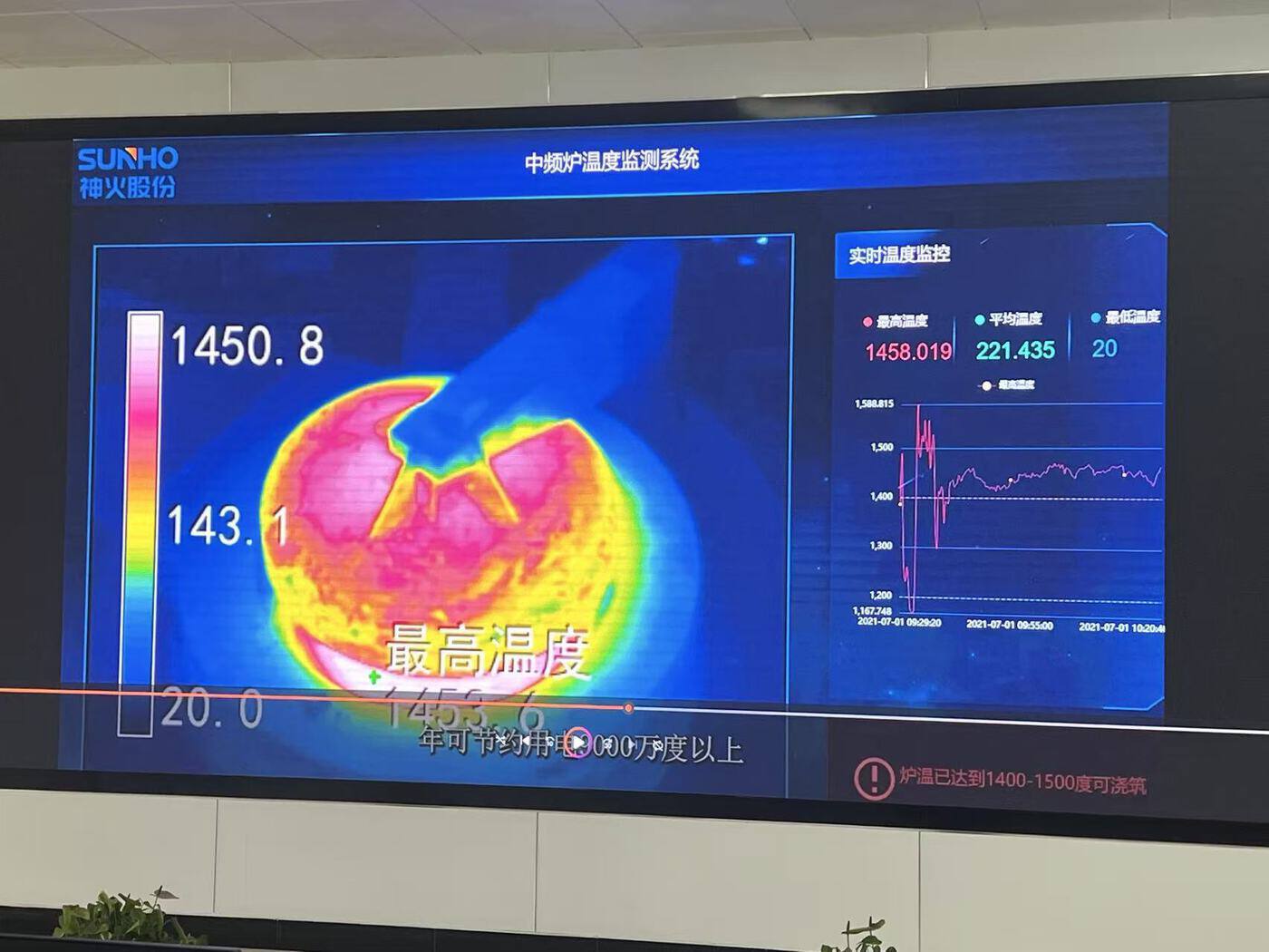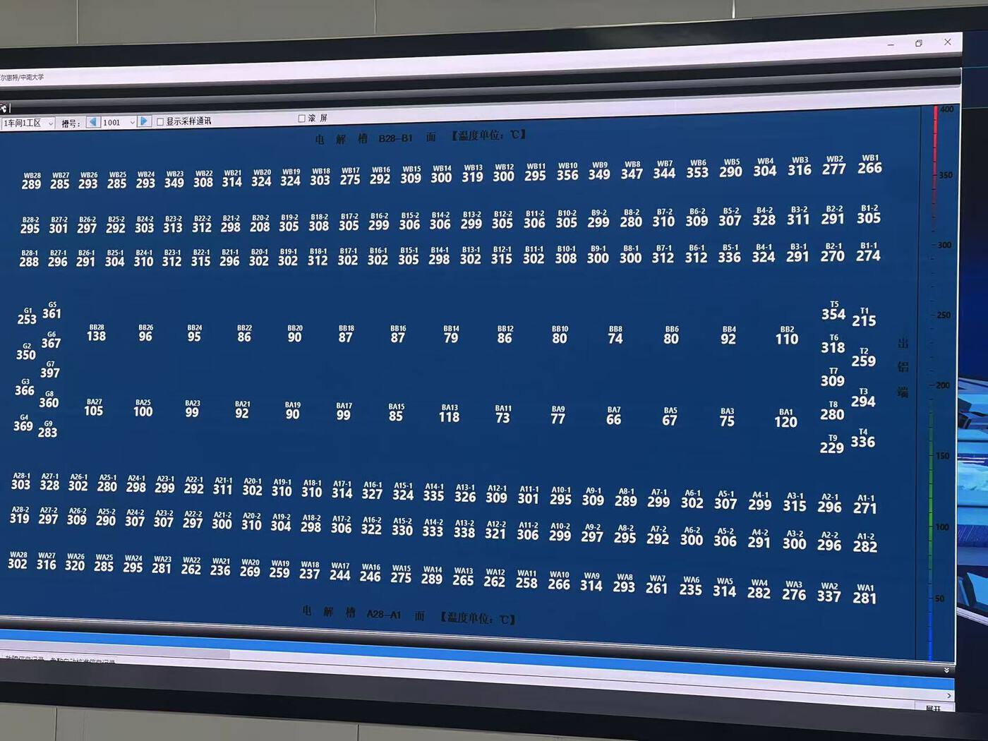 电解槽反应时危险性高,如果发生铝水泄漏的问题,损失将以亿元为单位。为对电解槽进行密切监测,传统方法是由人对槽四周温度进行人工测量,但这样就面临数据不连续、不够精准,且人工多的情况。如今,通过系统监测,1台电解槽的214个点位温度清晰展示在屏幕上,省去了大量耗时耗工的成本,更提升了安全性。而这样的电解槽在厂区内共有658台,目前可实现一名工人对11台电解槽的监控。