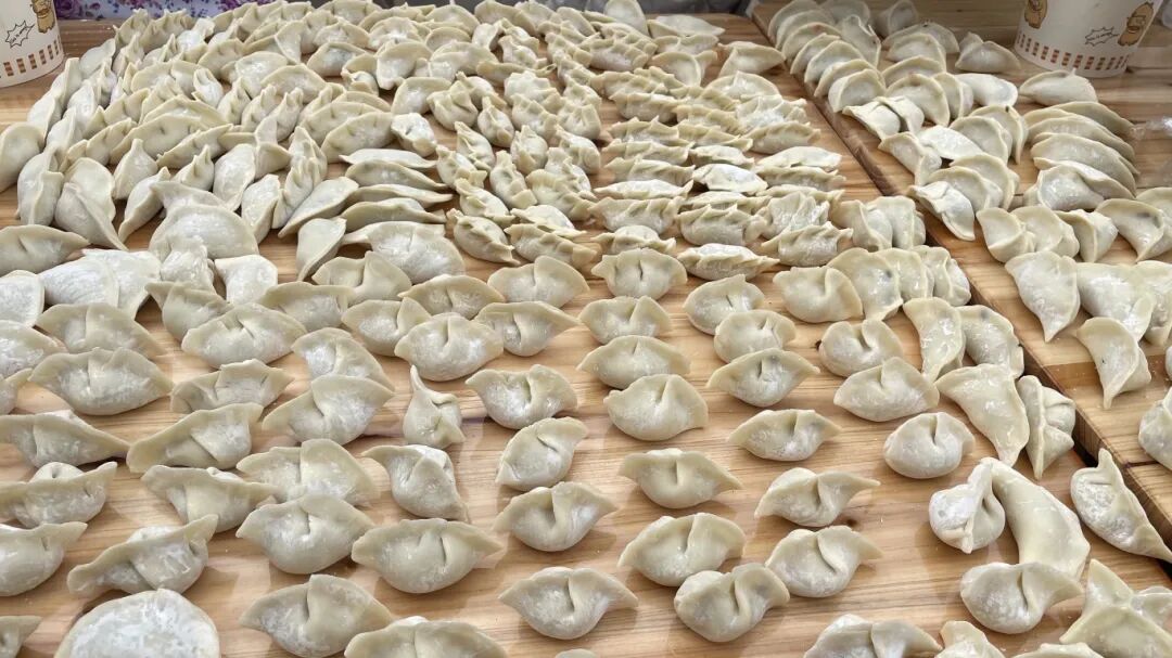 大家打开脑洞,把饺子包出元宝形、月牙形等等,欢声笑语中,邻里的感情更近了。