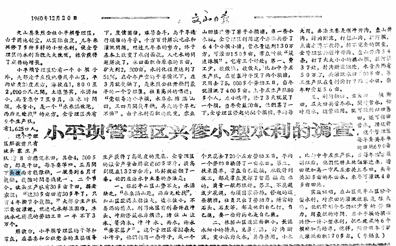 新中国成立后,小平坝村于20世纪50年代陆续修筑了四清坝、冬瓜冲坝等多座水坝,终于圆了乡亲们的“修水坝梦”。1956年至1960年,《文山日报》对小平坝村水坝工程作了《小平坝管理区兴修小型水利的调查》等多篇报道,实行土地改革以后,小平坝村积极响应国家兴修水利的号召,派员参加县里开办的“水利训练班”,组织村民利用山冲、低洼地等地形条件,自主设计、修筑“连珠坝”。从此,“到处跑”“无处找”的雨水在坝里“安家落户”,每年庄稼灌溉用水有了保障,粮食逐步增产稳产,许多原本靠“政府救济”吃饭的农户也纷纷变身“余粮户”。