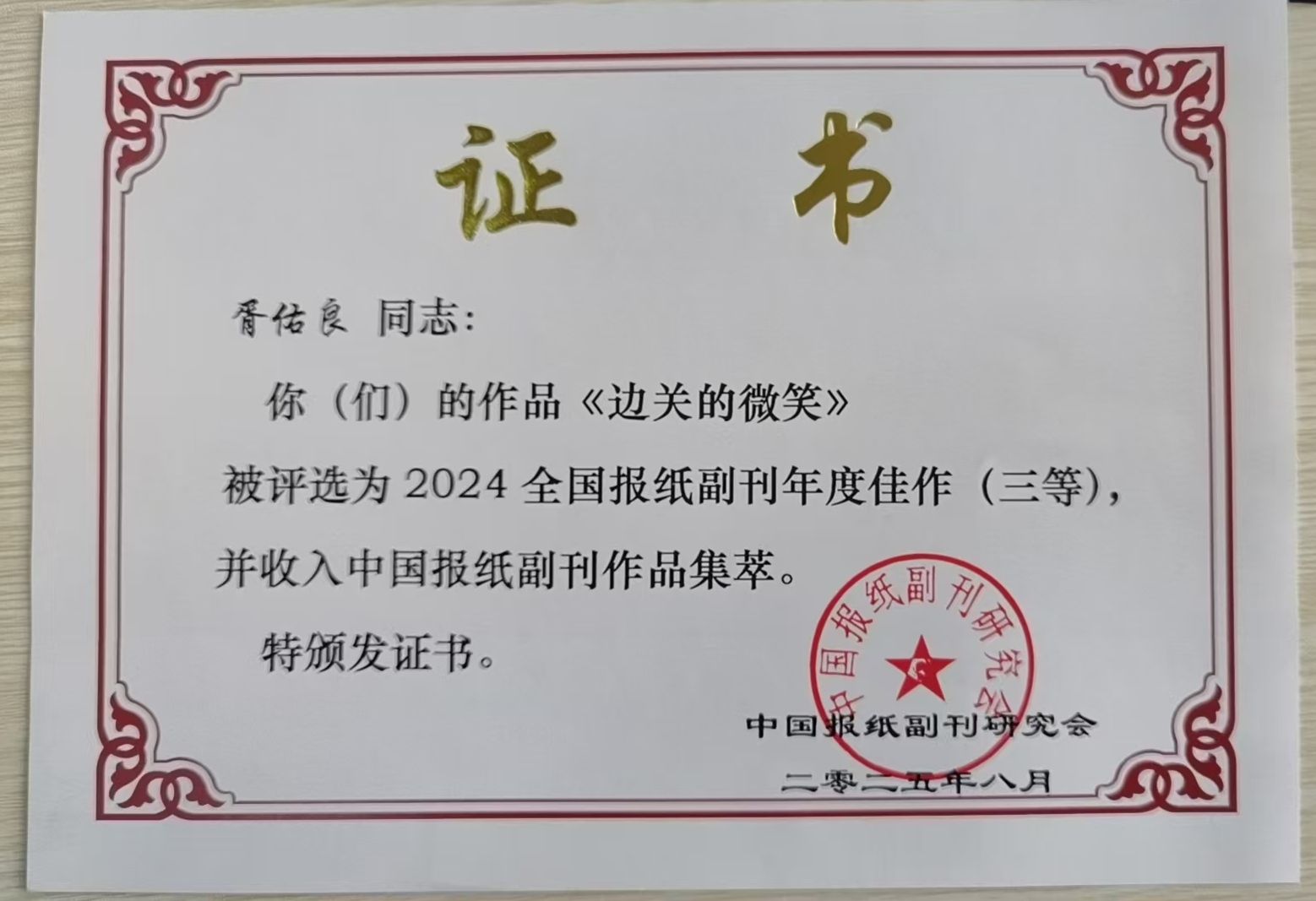 刊发于《文山日报》副刊版的散文《边关的微笑》获得中国报纸副刊年度佳作。