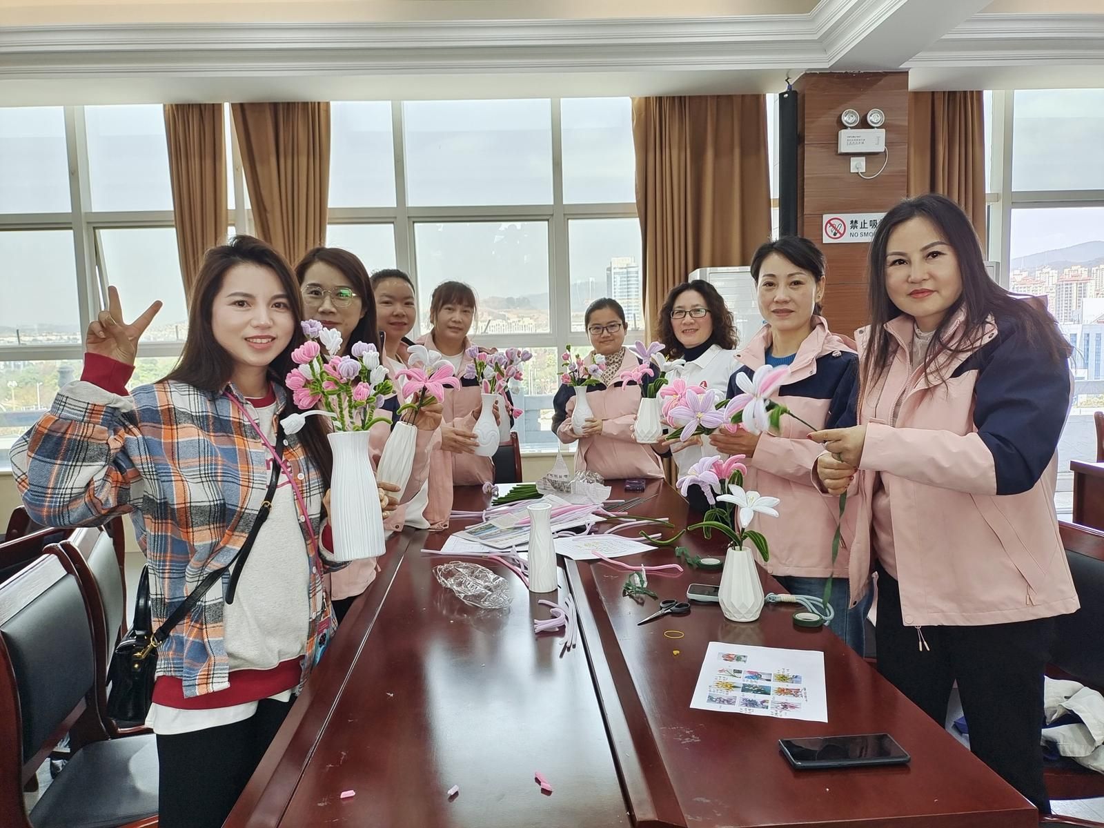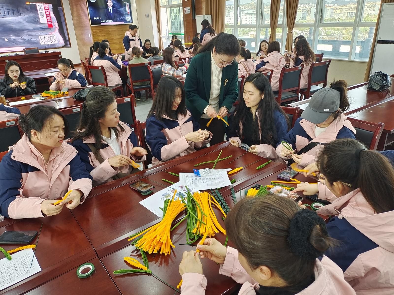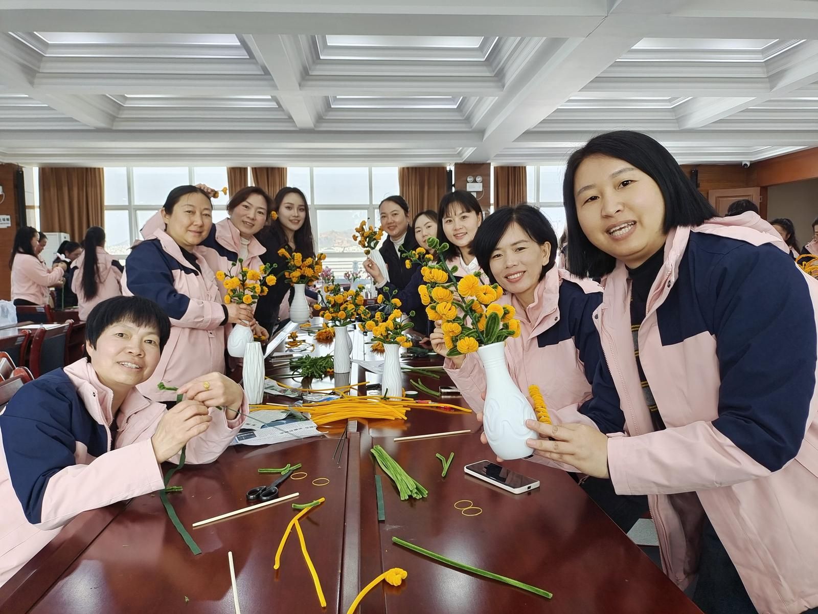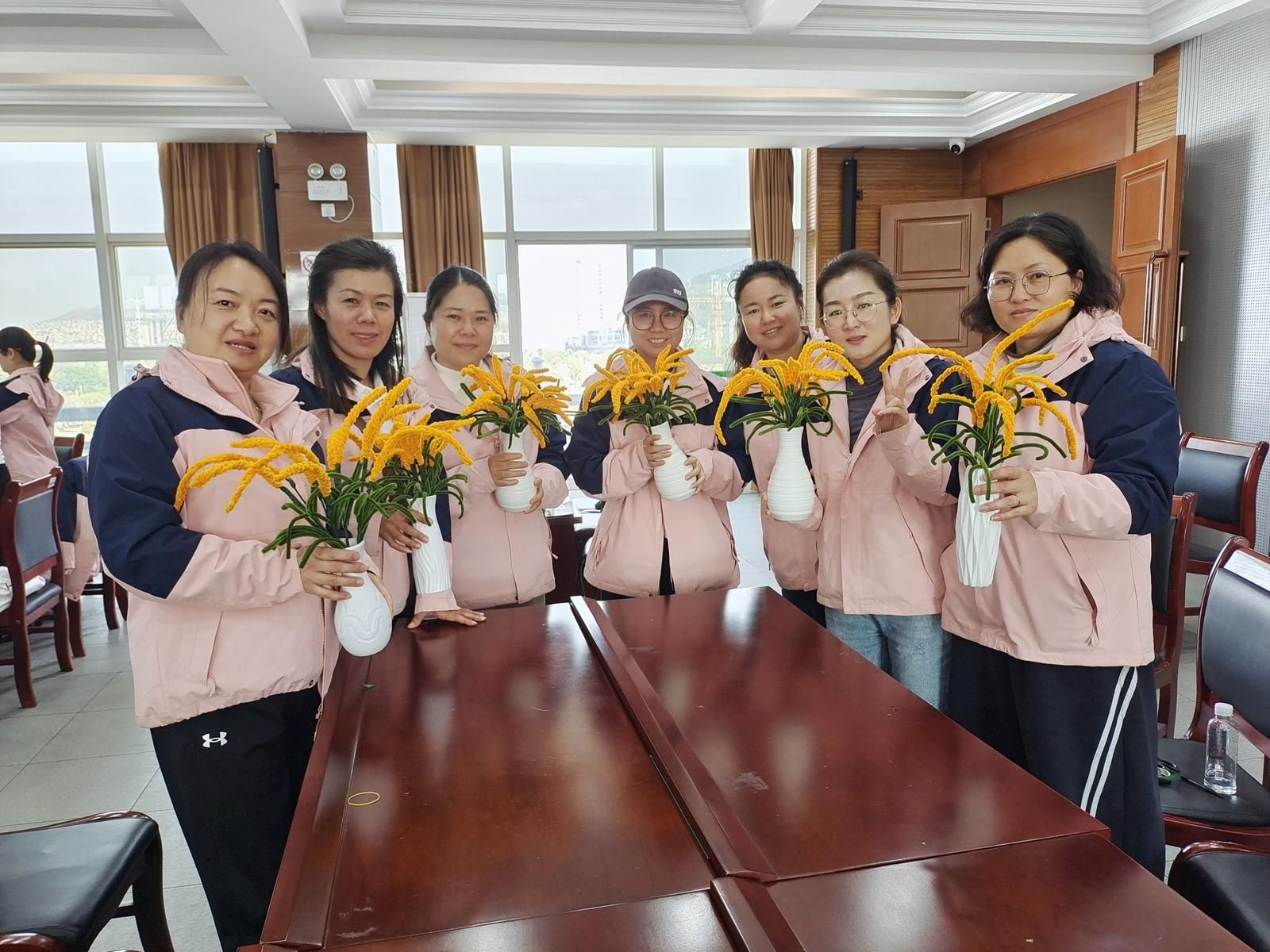 从一开始的生疏笨拙,到逐渐熟练上手,一朵朵色彩鲜艳、造型别致的绒线花在指尖悄然绽放。大家不仅感受到了手工的乐趣,也将美好的期许编织进了这一朵朵美丽的绒线花里。