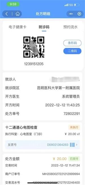 10.完成处方缴费后,在门诊缴费界面,可以选择已支付的处方进入处方明细界面,患者可凭二维码取药,或到检验检查科室处做相关的检验检查。