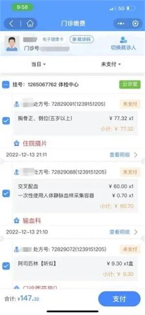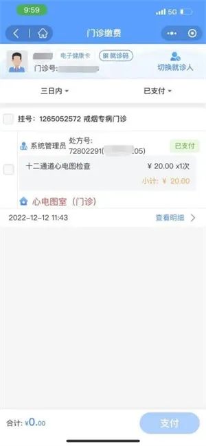 9.看诊后,医生如开具药品处方/检验检查,患者可到首页门诊缴费处选择待缴费的医嘱处方进行缴费。