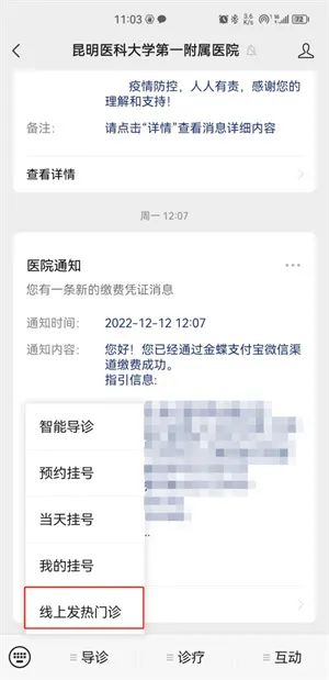 或登录昆明医科大学第一附属医院公众号,点击“导诊”按钮,通过线上发热门诊进入