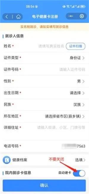 初次使用该小程序,需要微信授权登录,完成电子健康卡授权并添加就诊人,用户点击任意功能开始此步骤;用户按照系统提示完成即可(注意就诊人实名信息填写时不要关闭自动建卡开关)。