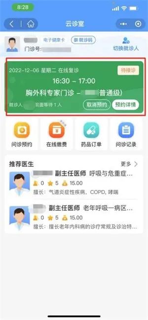 7.回到云诊室界面,出现待接诊的预约卡,等待医生接诊。