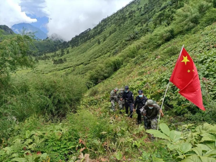 清晨,当第一缕阳光唤醒清晨的鸟儿时,洛本卓边境派出所民警与怒江州强边固防突击队的队员们开始了一天的边境踏查巡逻工作,因为清晨的执勤点温度相对较低,生火做饭耗时太长,大家都形成了早餐吃泡面、干粮的习惯,除了留守的两名队员,其它人员整齐列队,带上警械装备,高举鲜红的五星红旗,从执勤点向着大垭口出发,山路崎岖,短短的5公里路程,来回一次最快都需要4个小时。