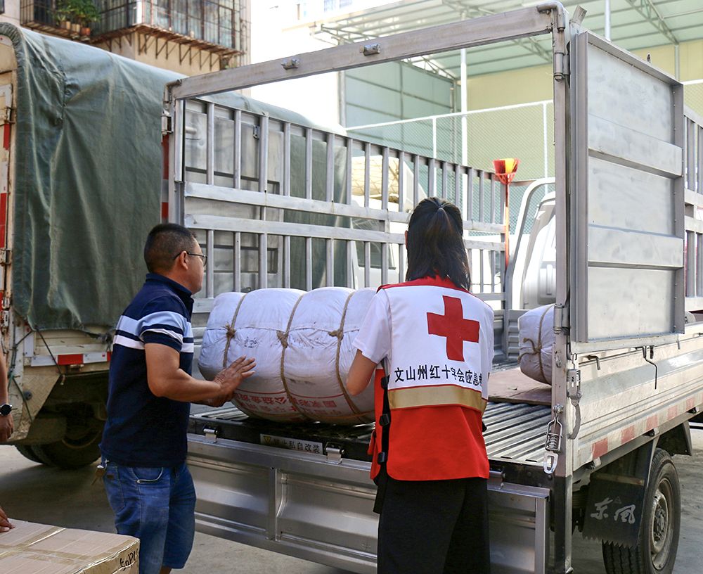 活动现场,州红十字会工作人员向文山、西畴、广南、富宁、马关、麻栗坡6县(市)发放了总价值100520元的应急物资,包括价值46520元的棉被200床、赈济家庭包100个;价值54000元的应急救护包1200个。这批应急物资将及时分发到6县(市)337个疫情防控站(点),第一时间发挥作用,保障执勤队伍紧急情况下的生命安全,为助力我州强边固防和疫情防控工作作出红十字会应有贡献,让红十字精神和旗帜飘扬在壮乡苗岭、祖国边境。