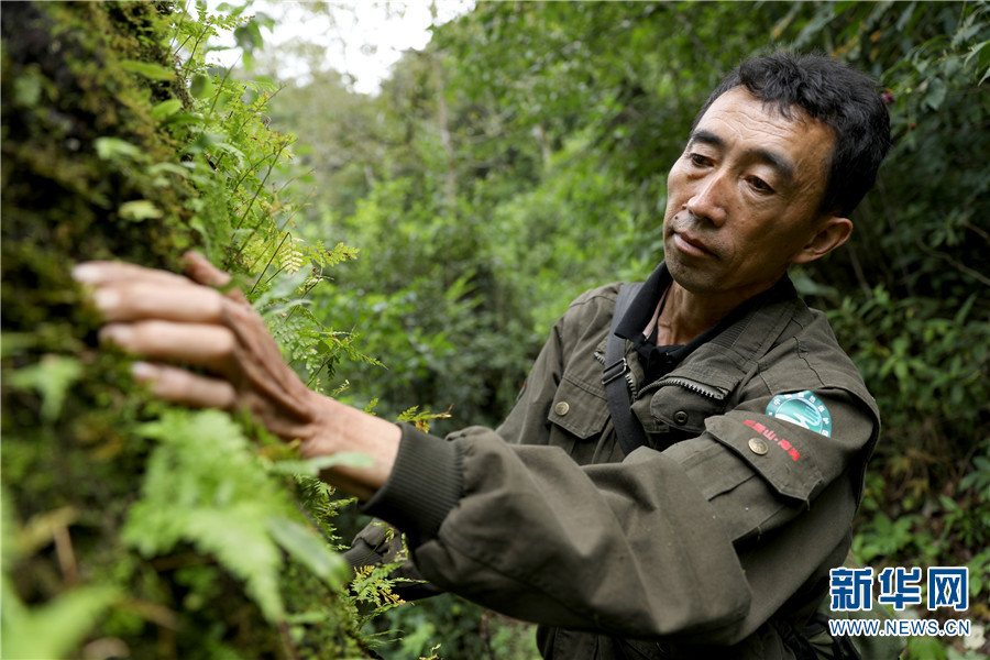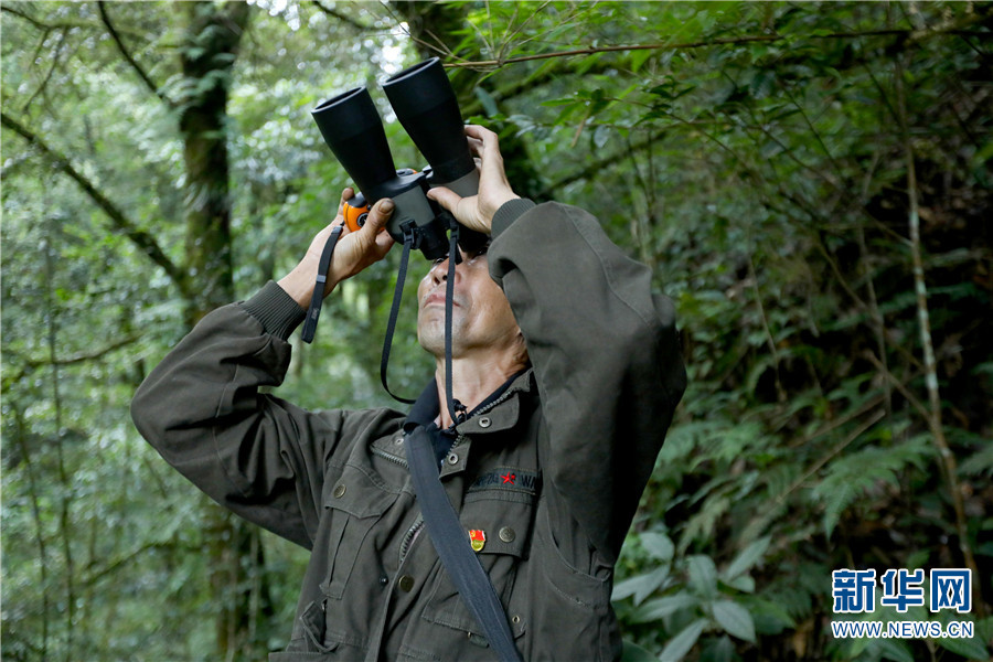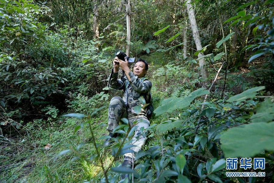 图为罗开春在进行野生动植物监测(9月25日摄)。新华网 李浩 摄