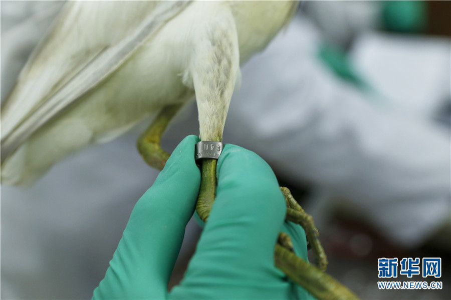 图为袁玉川将刻有编号的特殊金属环固定在鸟儿的跗跖上(9月27日摄)。新华网 赵普凡 摄