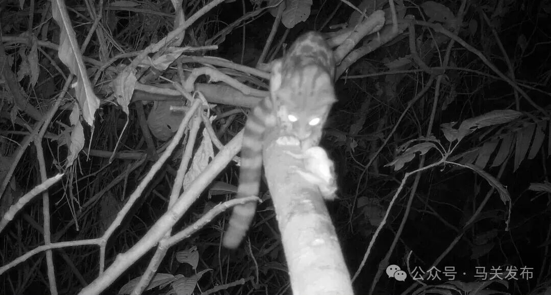 近日,云南文山马关古林箐省级自然保护区工作人员回收整理红外相机资料时,发现有一个红外相机拍摄到斑林狸捕食老鼠全过程。从红外相机画面可以看到,斑林狸仔细环顾四周,等待老鼠的出现,发现老鼠后,迅速向树下冲去,不一会儿,嘴里就叼着一只大老鼠,爬到树杈上,认真地啃食起来。斑林狸是国家二级保护野生动物,体型略比家猫大,行动快速敏捷,夜行性,主要以鼠类、蛙类、鸟类和昆虫等为食。